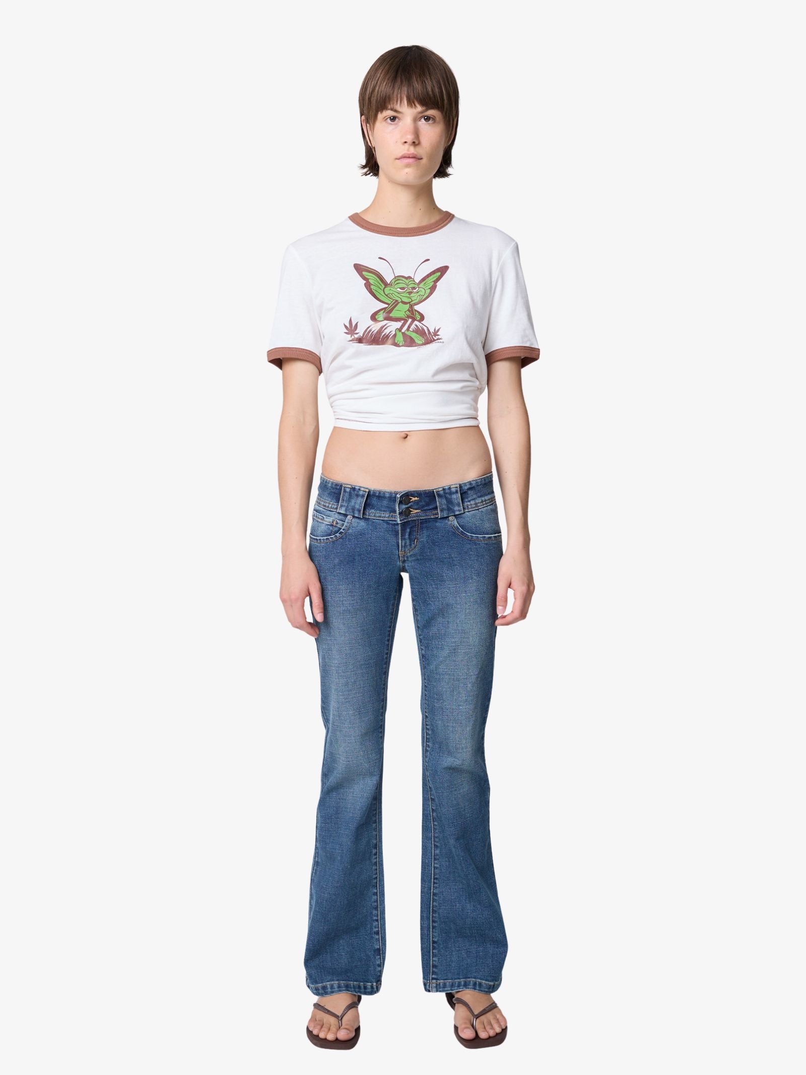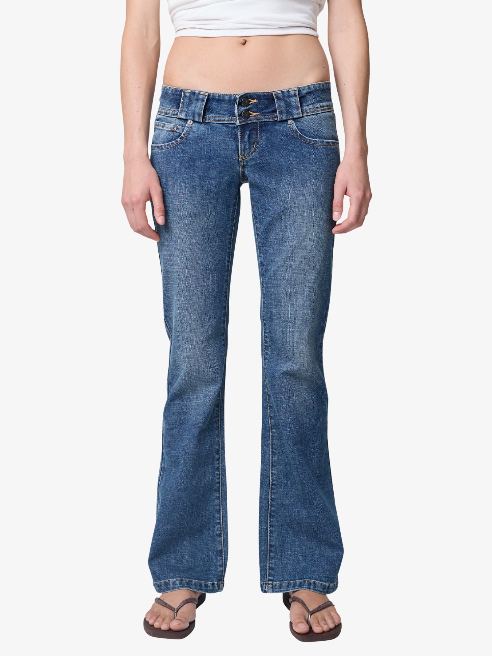 The 00 Kick Andy Jeans by Abrand are designed with a low-rise waist and a slim fit through the thigh. They finish with a slight kick flare at the hem for a balanced silhouette.