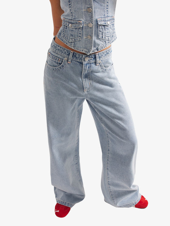 The 95 Baggy Avril Jeans by Abrand is a full-length, wide-leg jean with an ultra-relaxed, loose fit. It is constructed from rigid denim in a light blue wash, which features a subtle all-over textured/patterned effect. The fit is high-waisted and designed to stack heavily over the shoes.