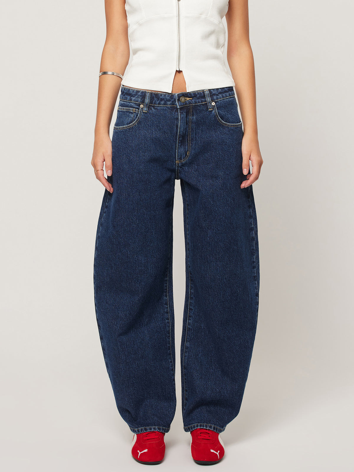 The 95 Barrel Jean Tara by Abrand offers a relaxed yet refined silhouette. Designed with a flattering mid-rise waist, these jeans feature a distinctive bowed leg shape that tapers slightly for an effortless finish just below the ankle.