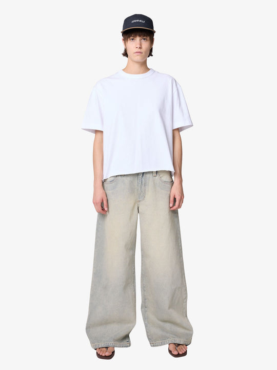 The 99 Mega Baggy Jeans Tyra by Abrand are made from heavyweight cotton denim and designed with an extremely loose, wide-leg fit. These jeans feature a relaxed waistband and a faded wash for a distinct vintage look, with two large pockets on the back.