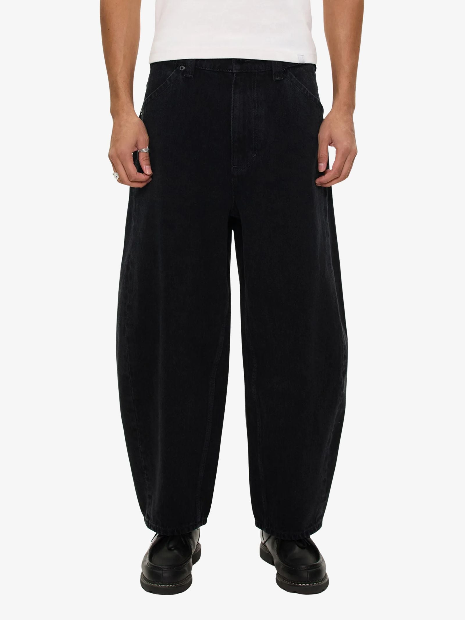 The A6 Big Cocoon Skyler Jeans by Abrand is a loose-fit denim pant featuring a bold cocoon shape created by twisted seams and integrated panels. This silhouette sits just below the belly button and includes an internal drawcord in the waistband for a customizable fit, complemented by oversized utility pockets and tonal hardware.