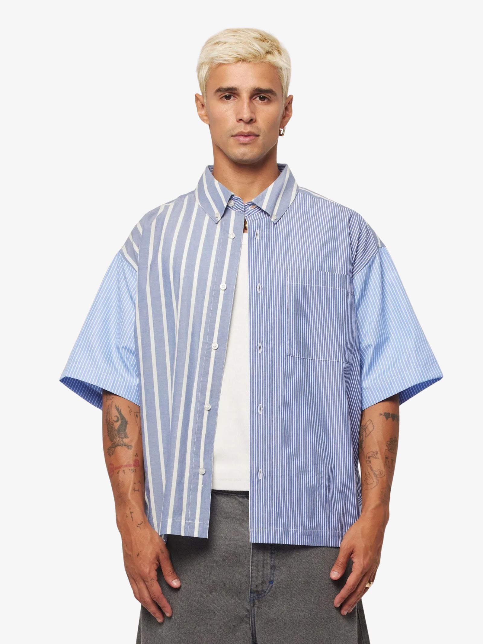 The Bobby Mixmaster Shirt is a short sleeve, button-front shirt featuring an oversized silhouette with contrasting vertical stripe panels in tonal blues and white. It is constructed from Cotton, designed with a classic pointed collar, a chest pocket, and short sleeves.