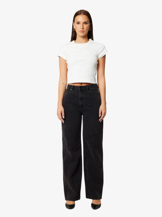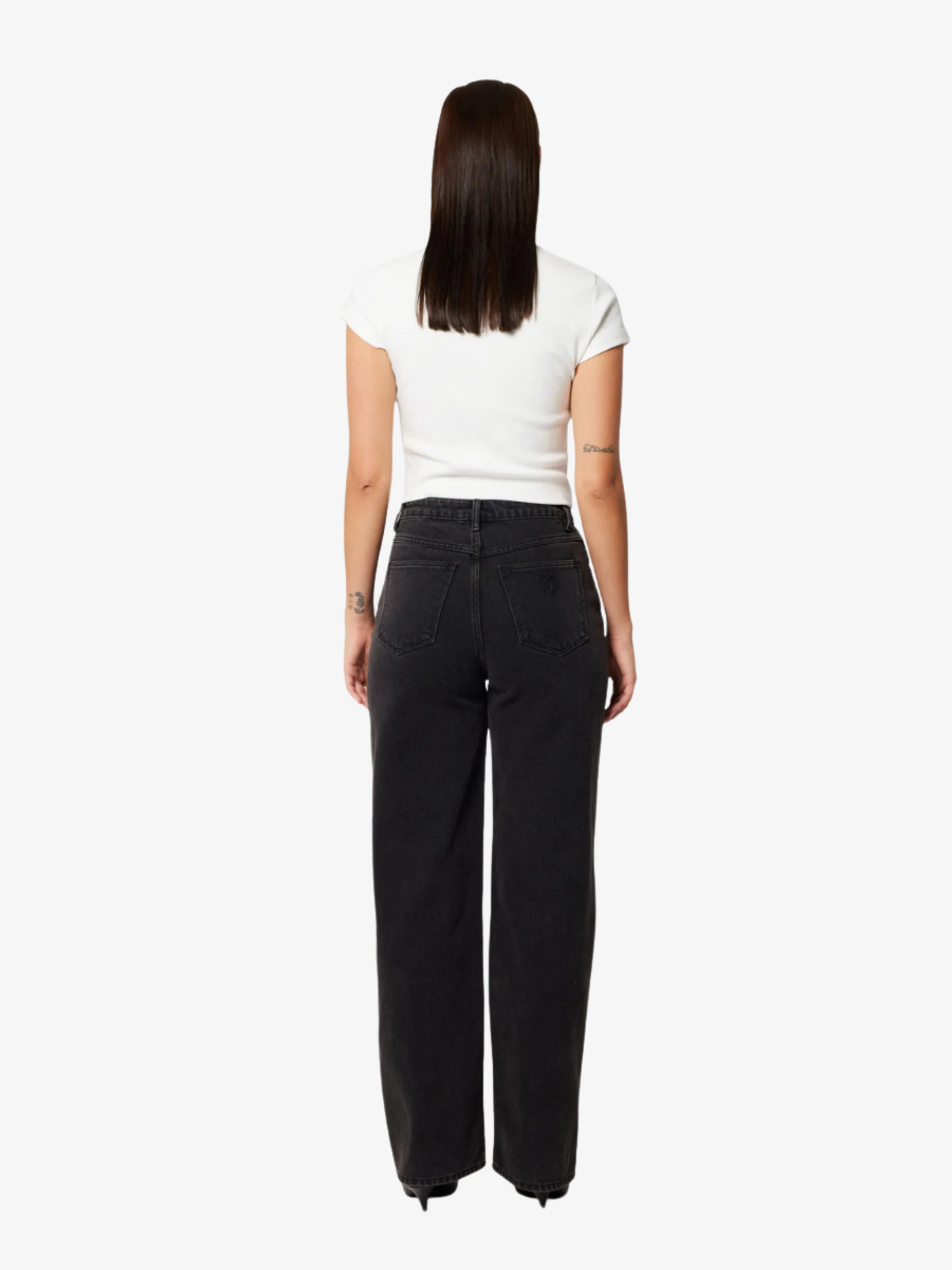 The Carrie Jean Heidi by Abrand is crafted from washed black denim and has a flattering high-rise waist and slim, straight-leg fit. These jeans offer a classic, refined silhouette that pairs effortlessly with casual looks.