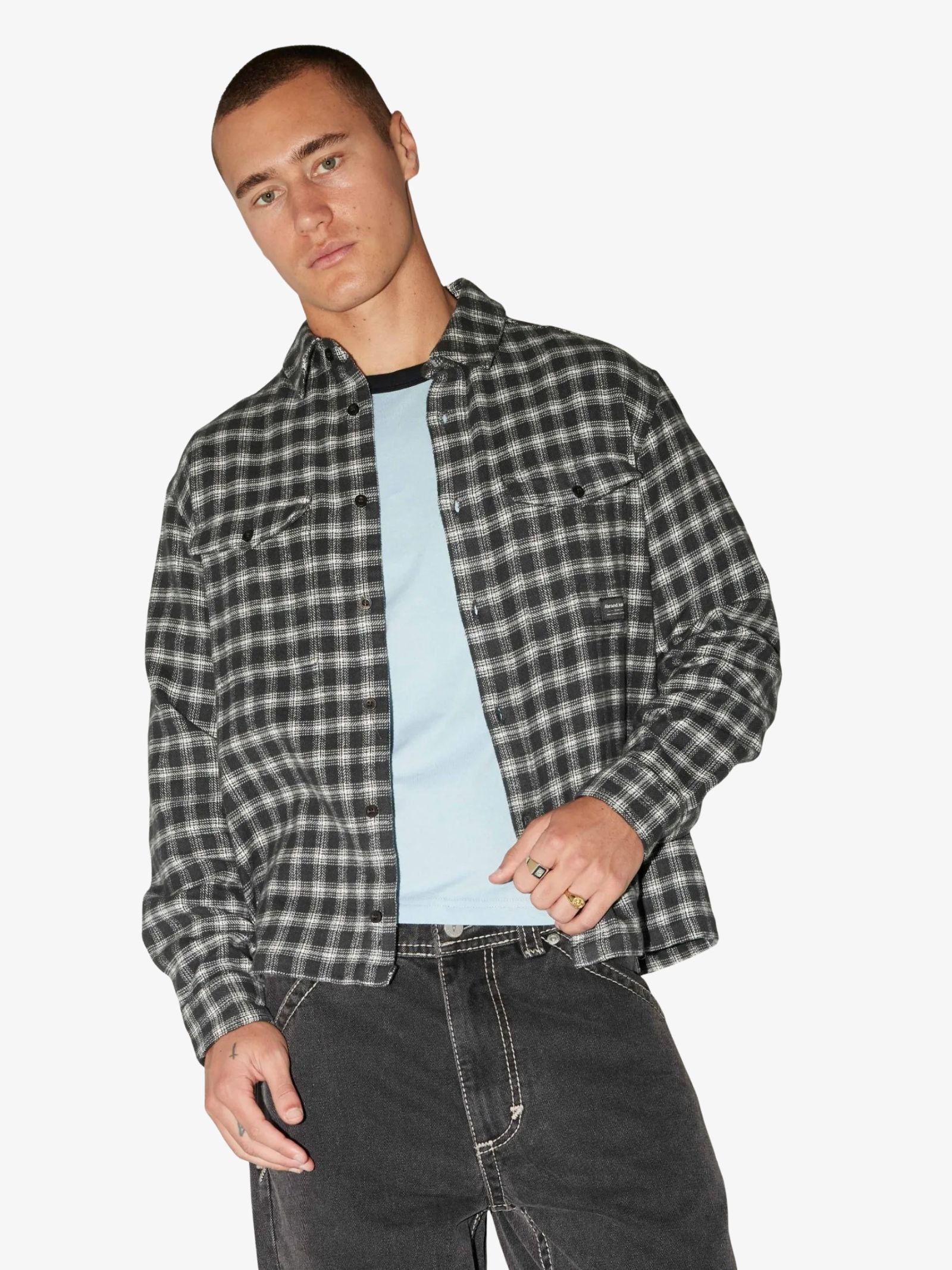 This Hardware Flannie Shirt by Abrand is a long sleeve, button-front shirt cut with a boxy, oversized fit and a straight hem. It is finished in a classic black and white plaid pattern and features dual button-closure chest pockets.