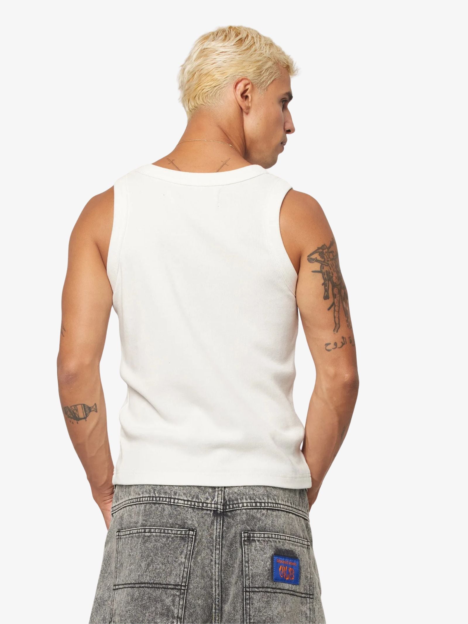 The Troye Tank by Abrand channels classic ‘90s style with a modern edge. Designed with a fitted shape and wide straps, it delivers a clean, athletic look that works effortlessly on its own or layered under an open shirt.