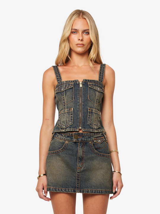The Utility Top Hillary by Abrand is tailored with structured boning and a front zip closure. This top fetures a square neckline and chest pocket detailing with adjustable straps and durable stitching throughout.