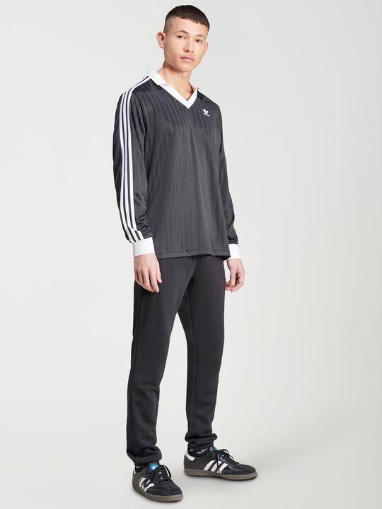 Featuring a classic football jersey design, this Adicolor Pique Football Long Sleeve T-Shirt offers a professional look with a regular fit and white contrast cuffs. Made with 100% recycled polyester, it also includes a ribbed V-neck with a collar, ribbed cuffs, and iconic Three Stripes down the sleeves. With a Trefoil embroidered on the left chest, this shirt combines retro vibes with modern sustainability.