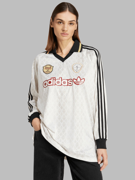 This Long Sleeve Jersey in Off White by Adidas is designed with a loose fit for effortless movement. This long sleeve jersey features archival details, long sleeves and structured silhouette.
