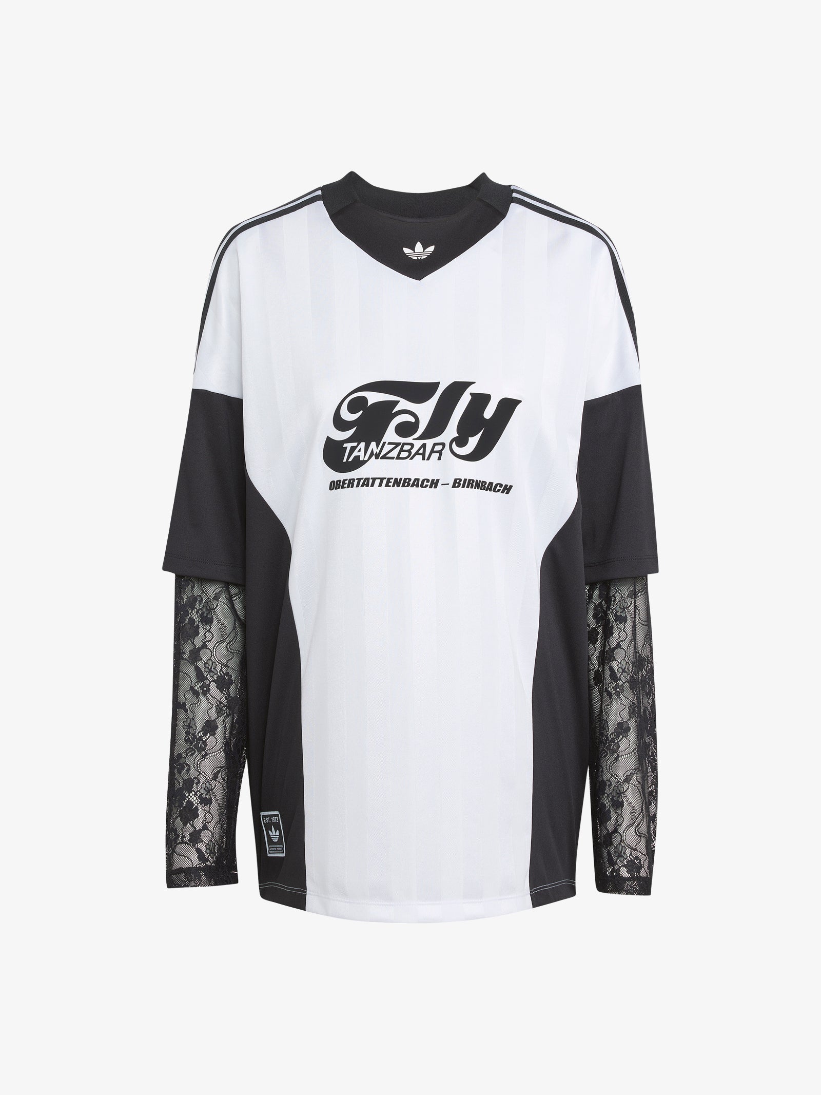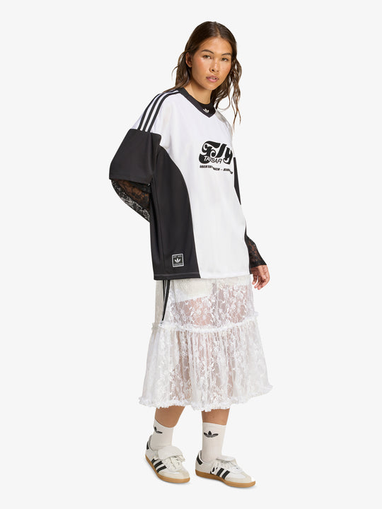 The Soccer Summer Fem Lace Long Sleeve Jersey by Adidas brings bold femininity to traditional football styling. Crafted in delicate lace with printed graphics, this oversized jersey is a standout from the "Soccer Summer" collection.