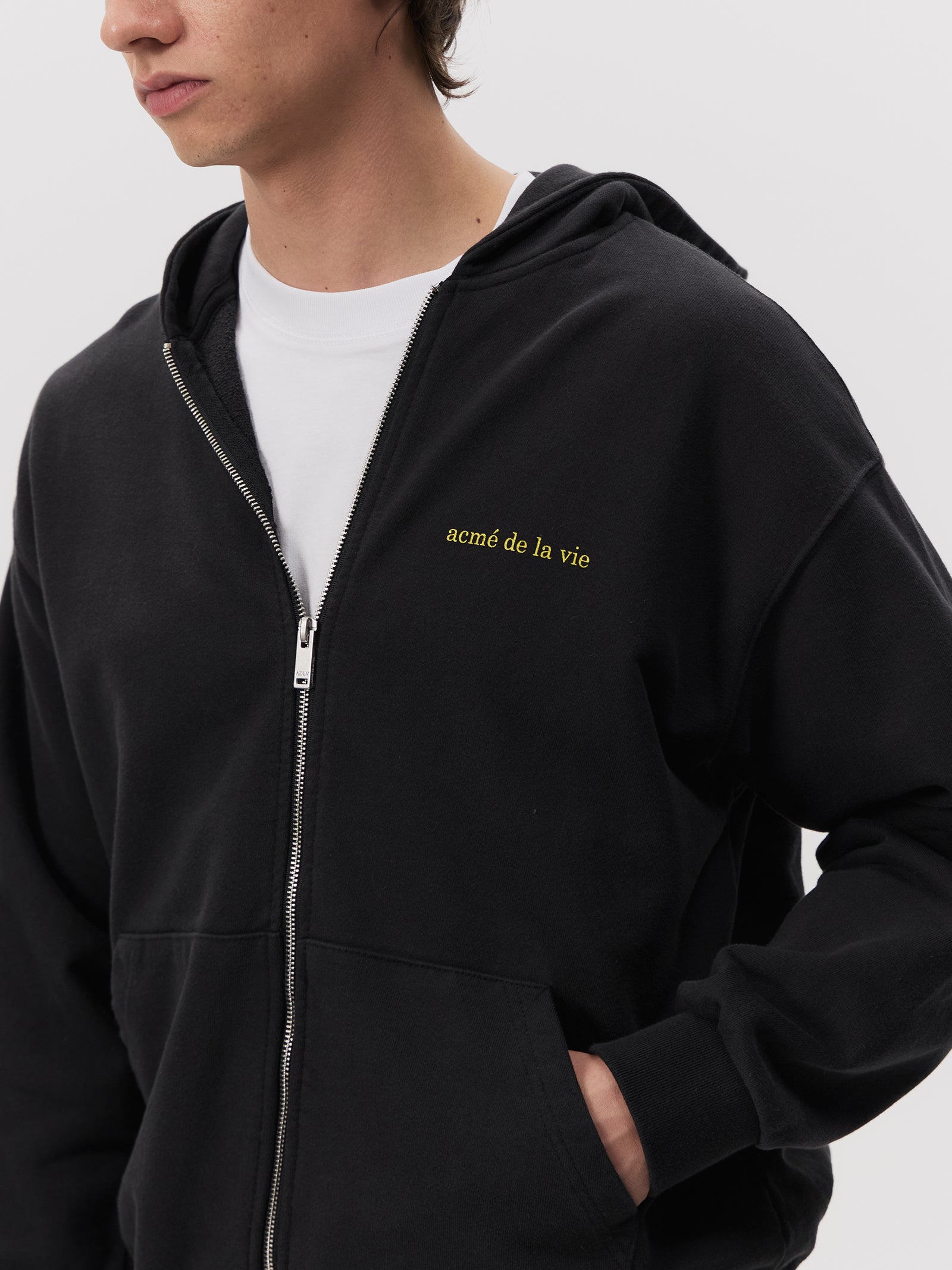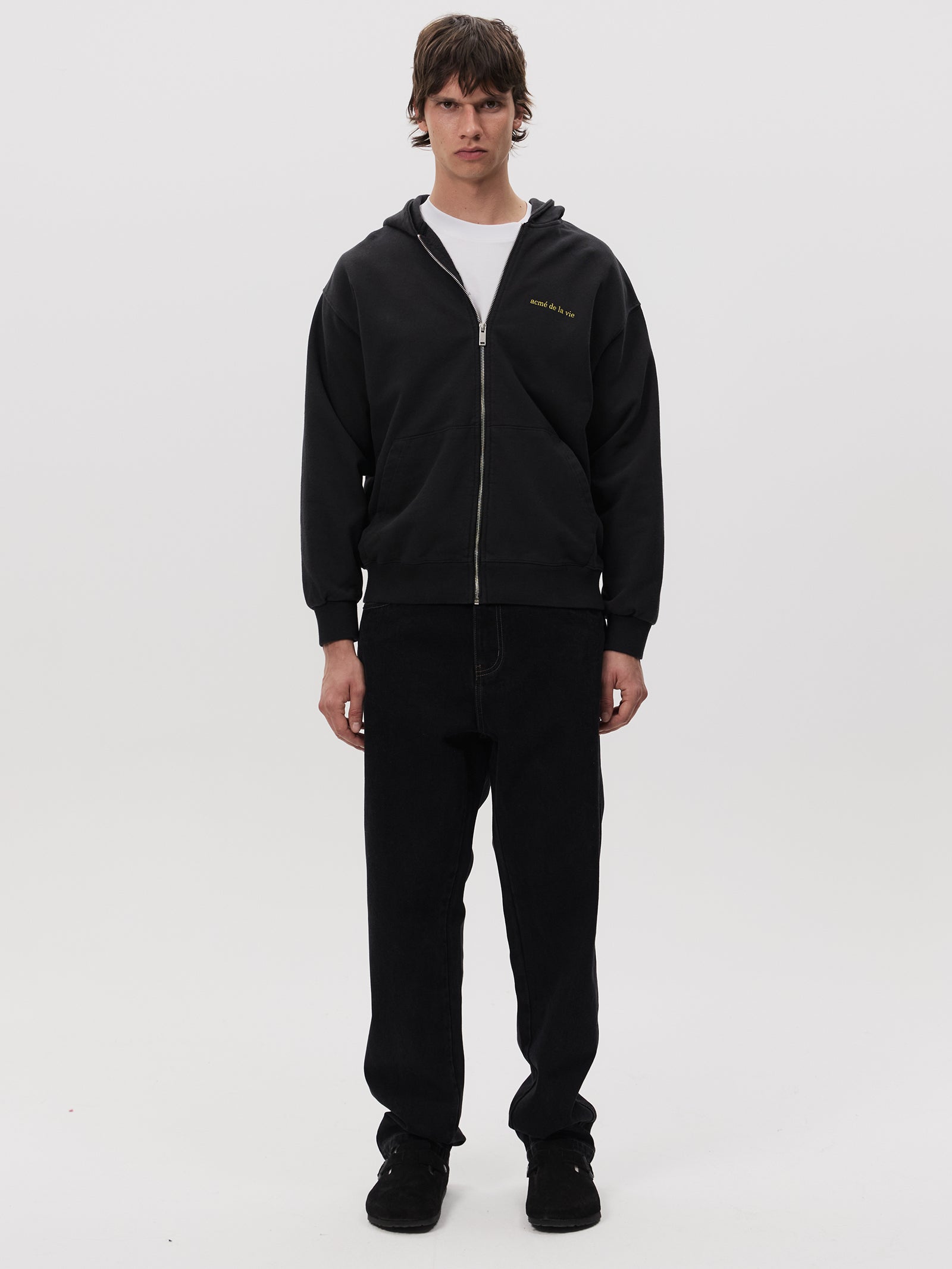 The Basic Bio Washing Hoodie Zip Up in Black by ADLV is crafted from 100% cotton. This hoodie features an oversized, unisex fit with dropped shoulders and a straight hem. It also offers a zip-up design and adjustable drawstring hood.