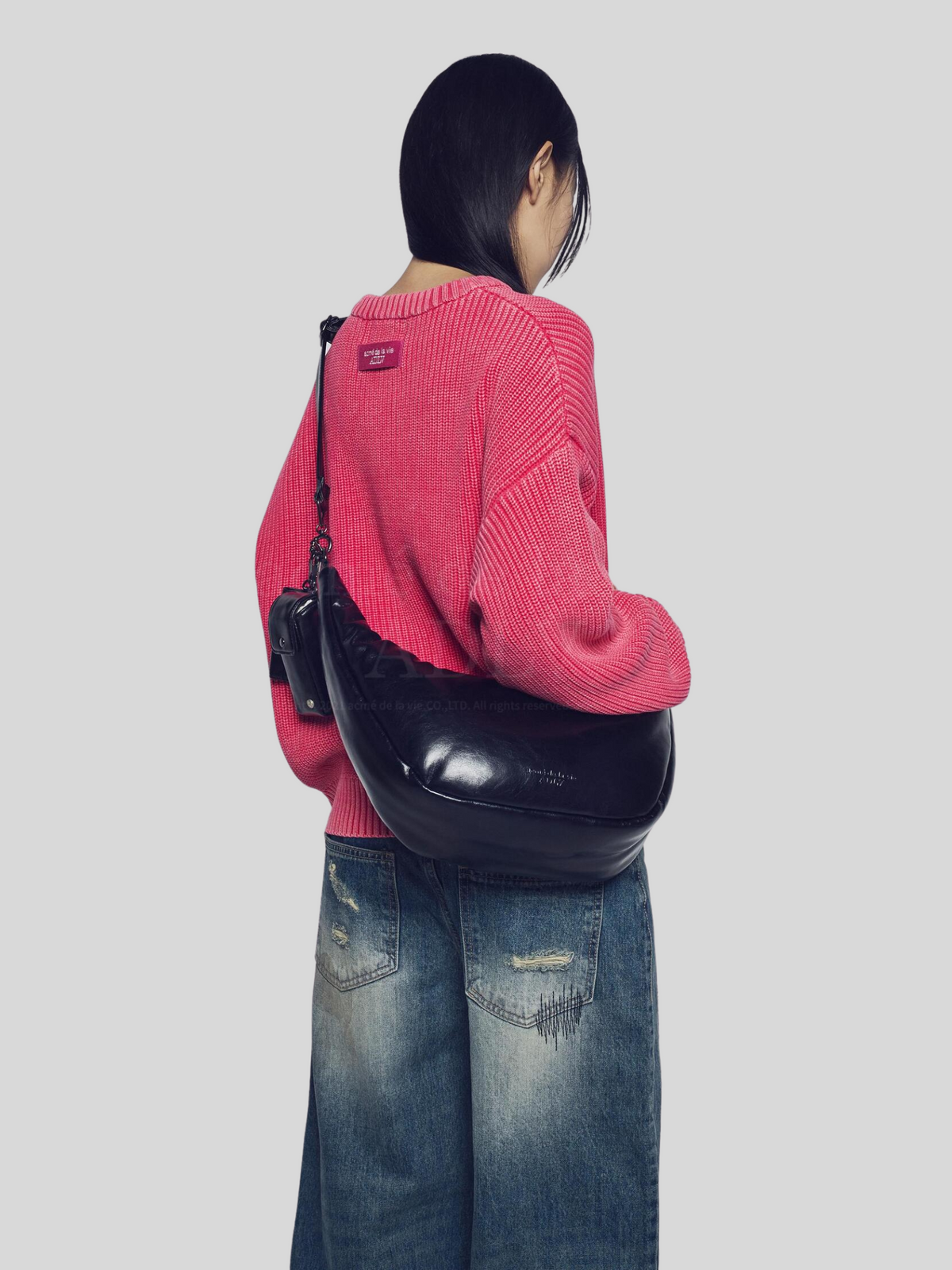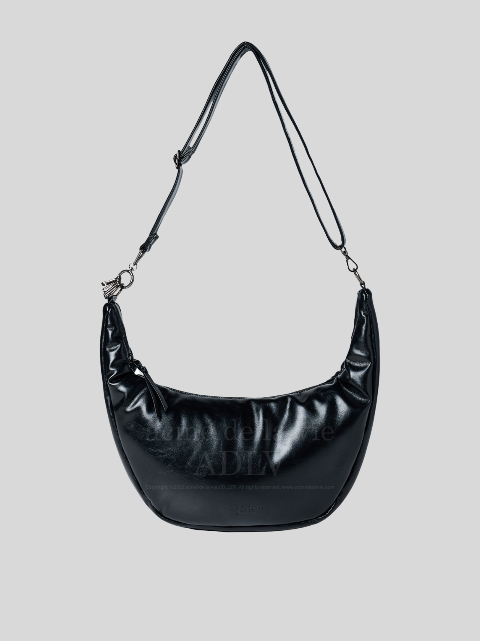 The Basic Logo Glossy Vegan Leather Cross Bag in Black by ADLV is crafted from high-quality 100% polyurethane. This crossbody bag offers a glossy finish and features the brand's signature logo, subtly embossed.