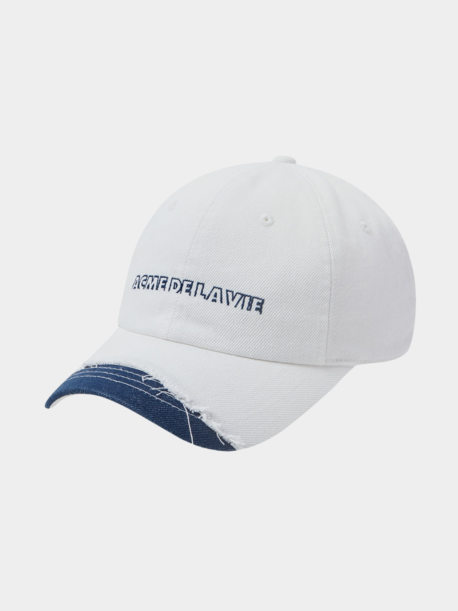 The Damage Washing Denim Point Ball Cap in White by ADLV is crafted from a durable blend of 57% cotton and 43% polyester. This unisex cap offers a distressed denim finish, a classic six-panel construction and adjustable strap.