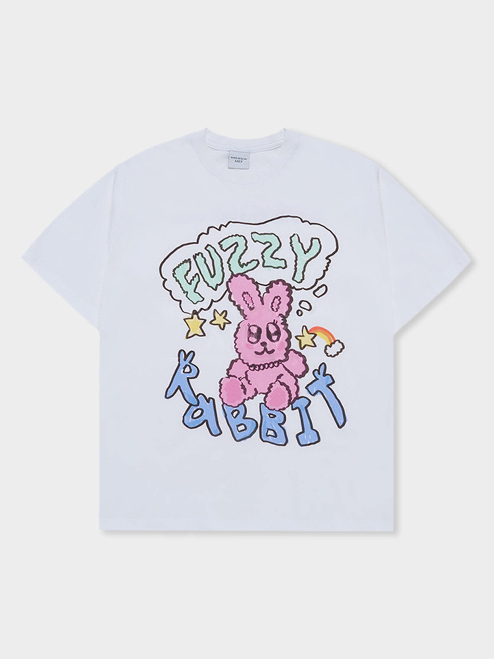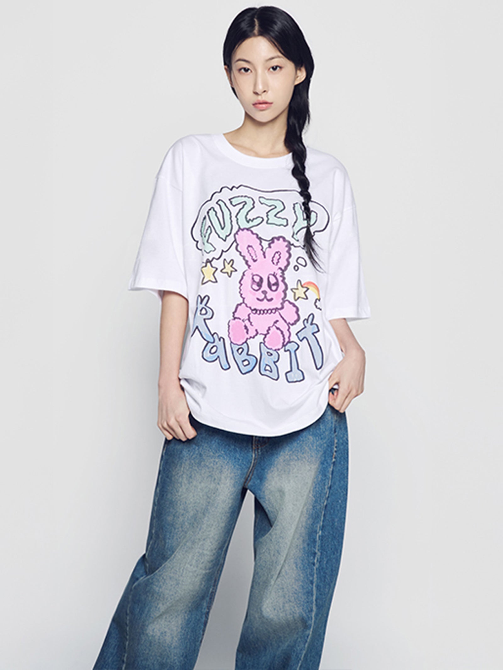 ADLV's Popstar Rabbit Short Sleeve T-Shirt in White showcases a playful graphic of a rabbit donning popstar attire, reflecting the brand's whimsical design approach. Constructed from 100% high-quality cotton, this oversized tee provides a comfortable and relaxed fit. The vibrant graphic adds a touch of fun to any casual ensemble, making it a standout piece.