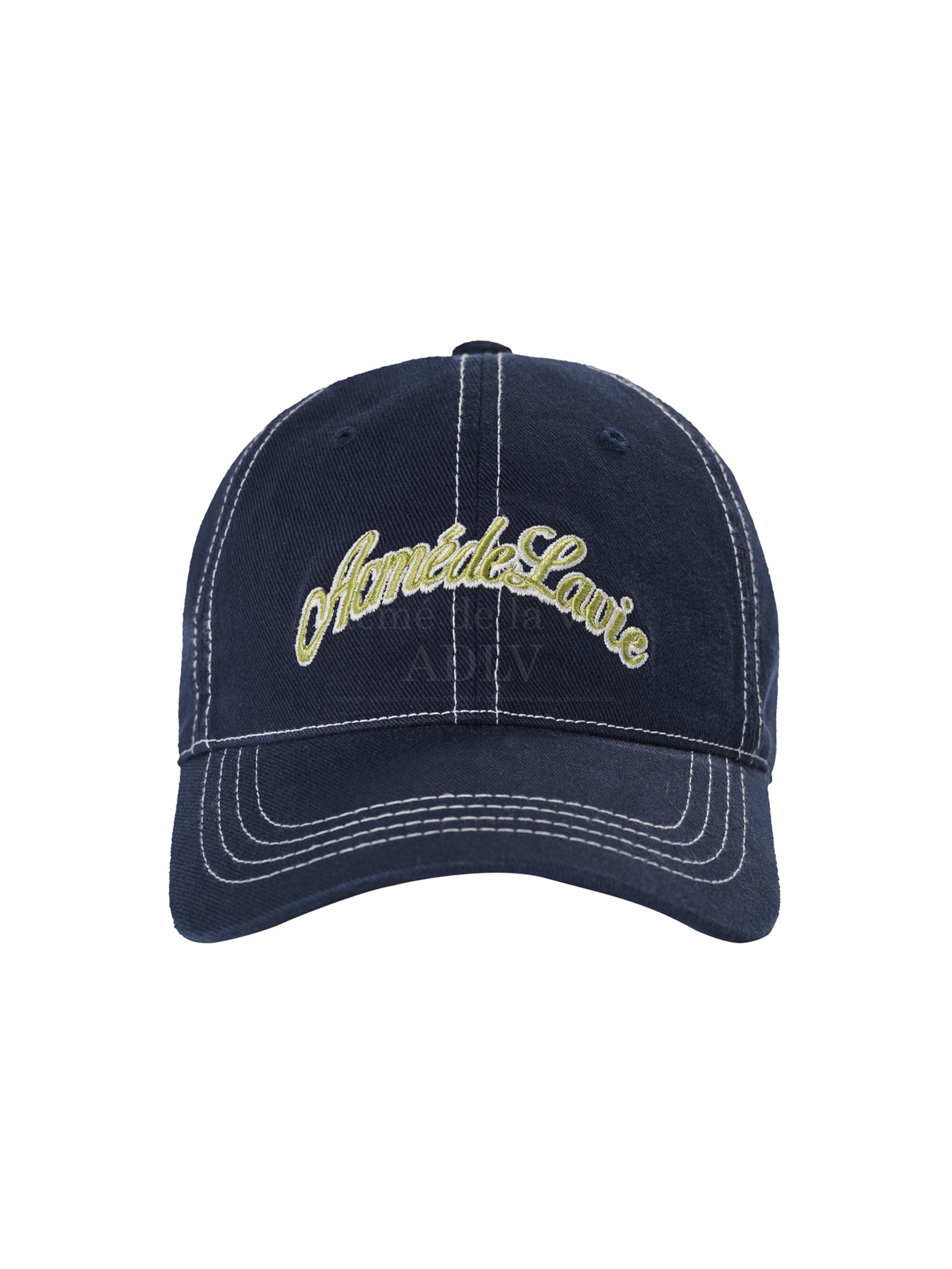 The Script Logo Color Embroidery Ball Cap by ADLV features contrast white stitching with a striking visual edge. This cap offers a curved brim and an embroidered logo on the front panel.