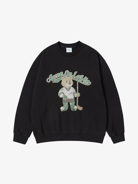 The Vintage Mascot Ac Bear Sweatshirt by ADLV is a long-sleeve crewneck top featuring a relaxed, oversized silhouette. This garment is designed with dropped shoulder seams and features a large illustrative graphic of a hockey-playing bear centered on the chest below arched branding.