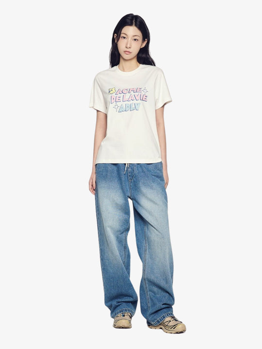 The Women's Ac Bear Candy T-Shirt by ADLV is made from soft cotton and designed with a straight, comfortable fit. This short-sleeve shirt features a dark charcoal color and a prominent retro-inspired logo graphic printed across the chest with bright lettering and star accents.