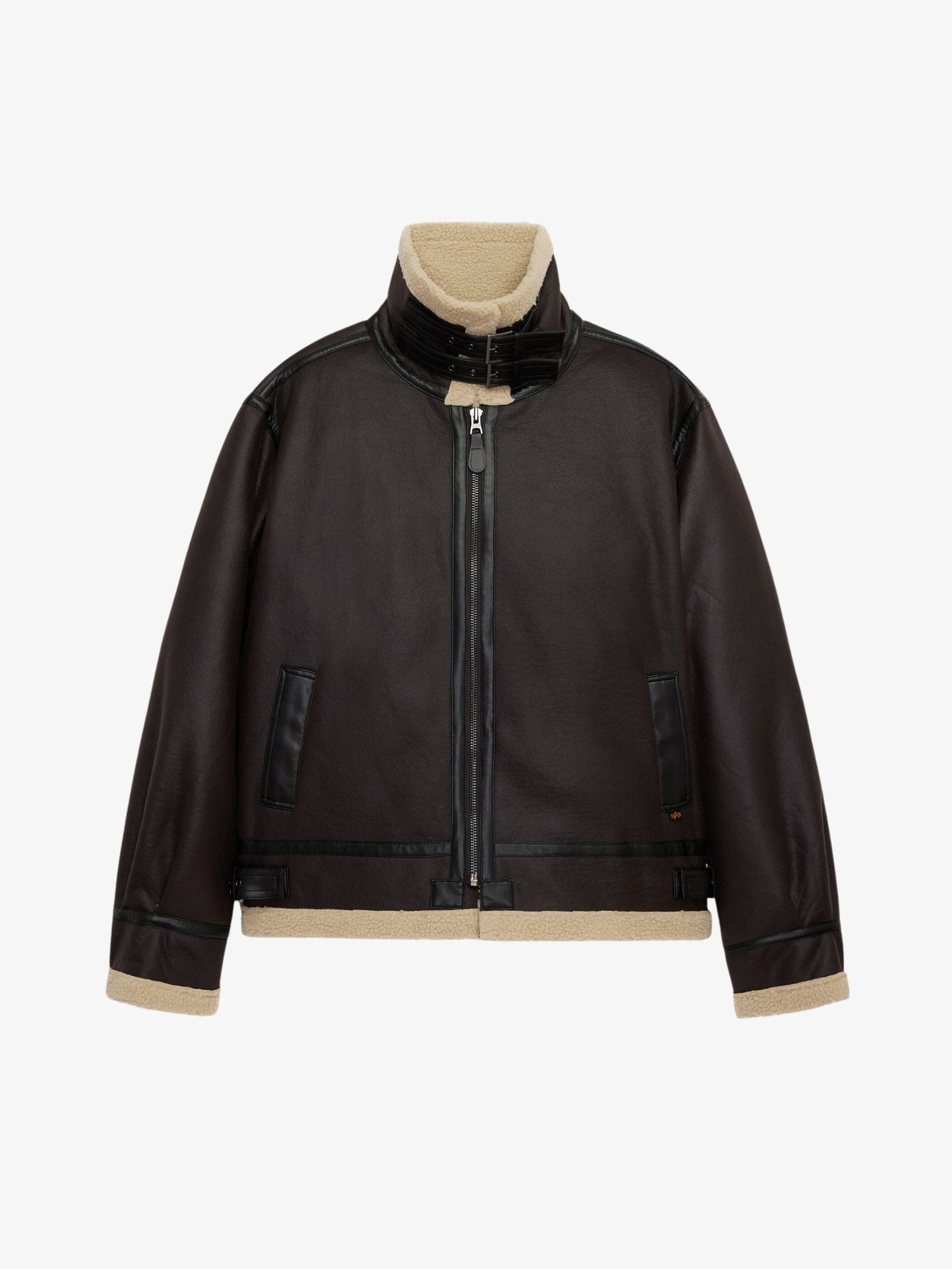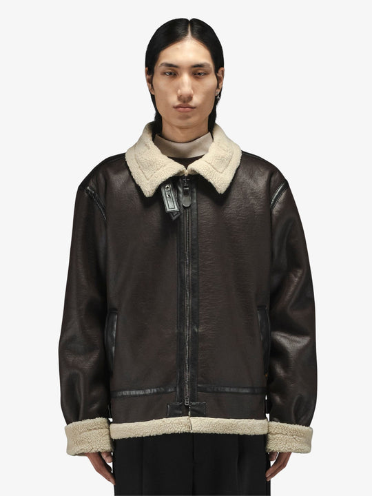 The Mouton B-3 Jacket by Alpha Industries is a heritage-inspired aviator piece featuring a rugged faux leather shell and a plush faux mouton interior. This relaxed-fit garment includes functional details such as two front welt pockets and adjustable buckles at the side hem for a custom fit. The design is finished with contrasting seam tape and a large shearling collar for intermediate weather protection.