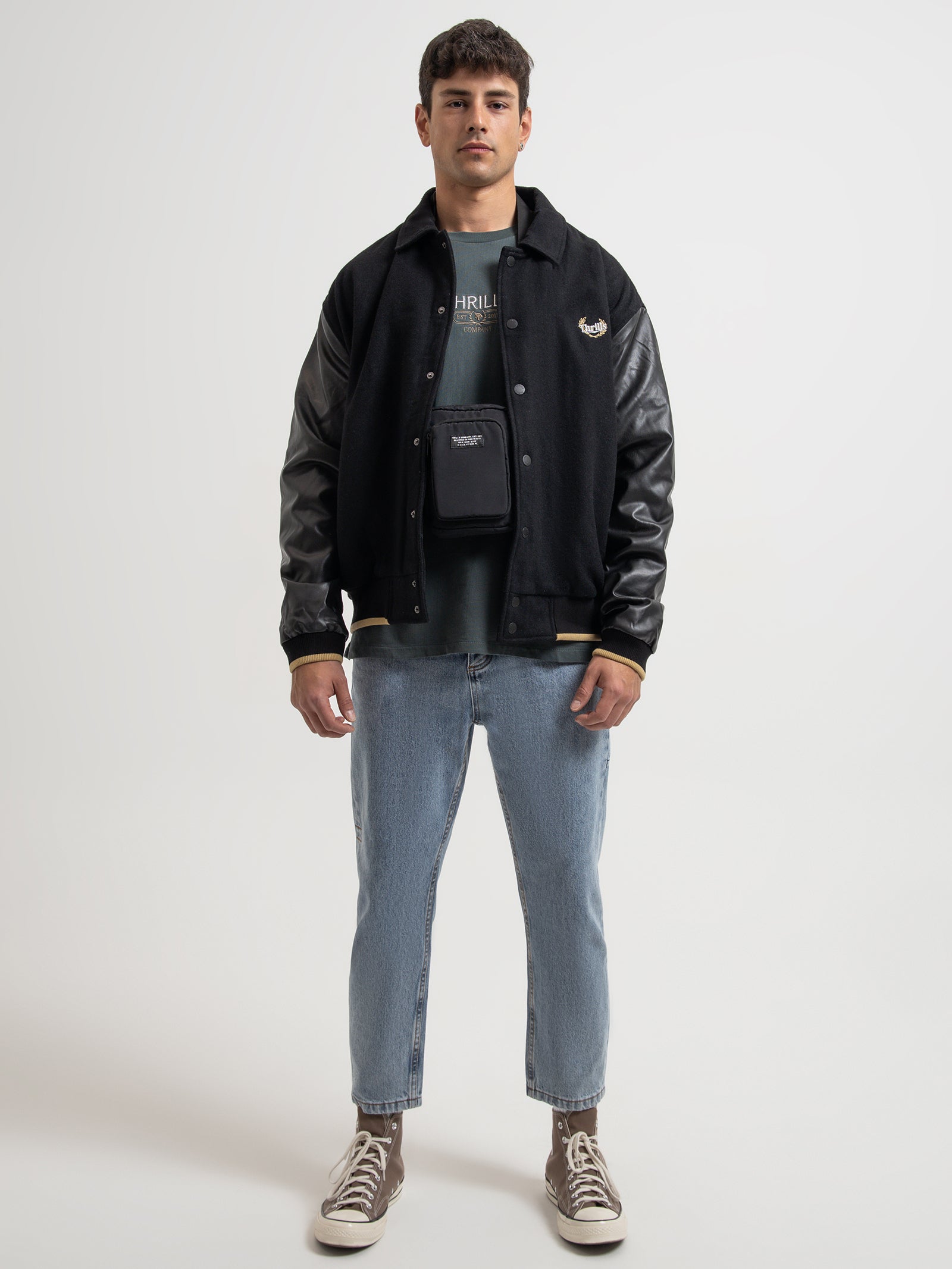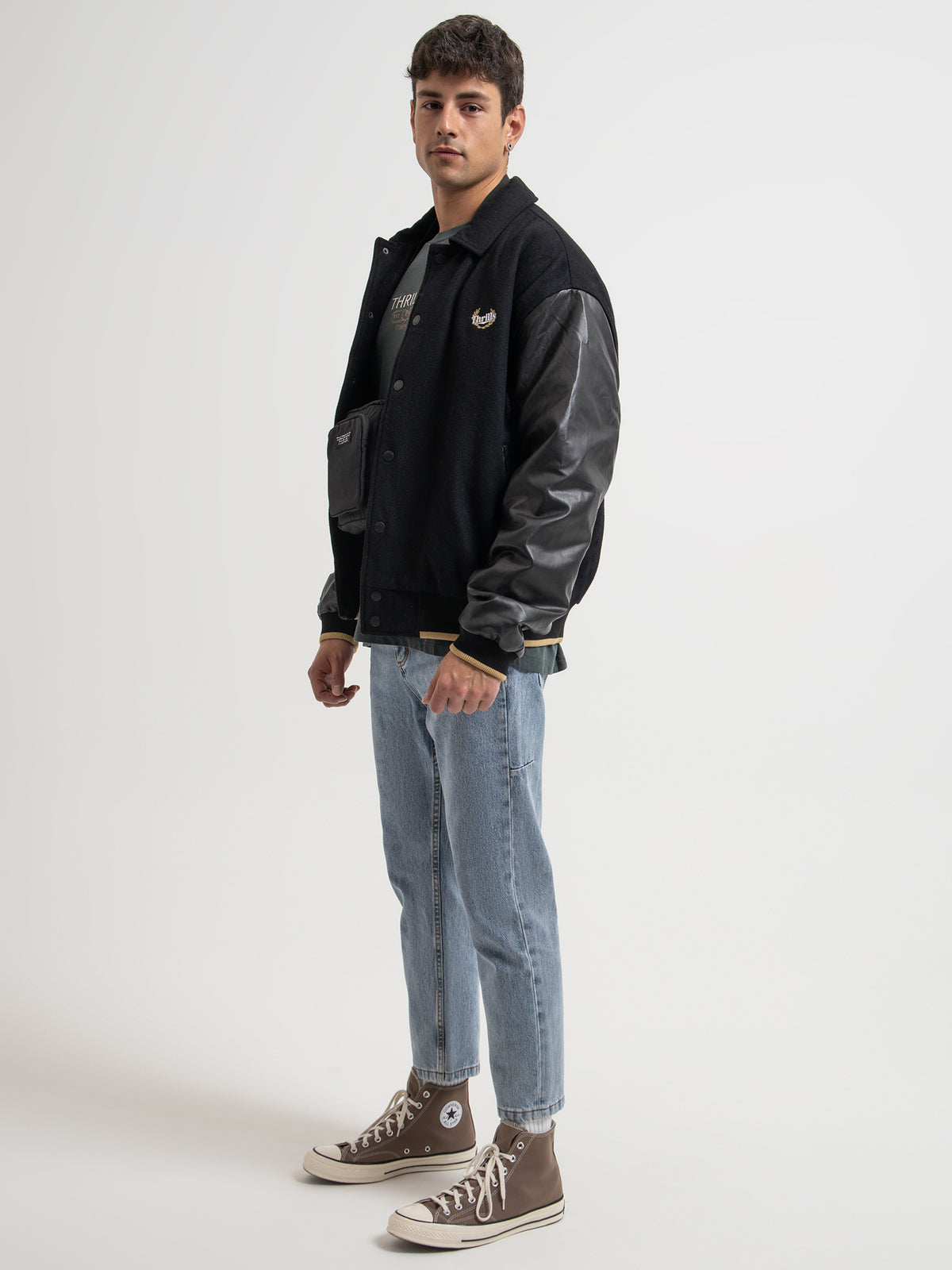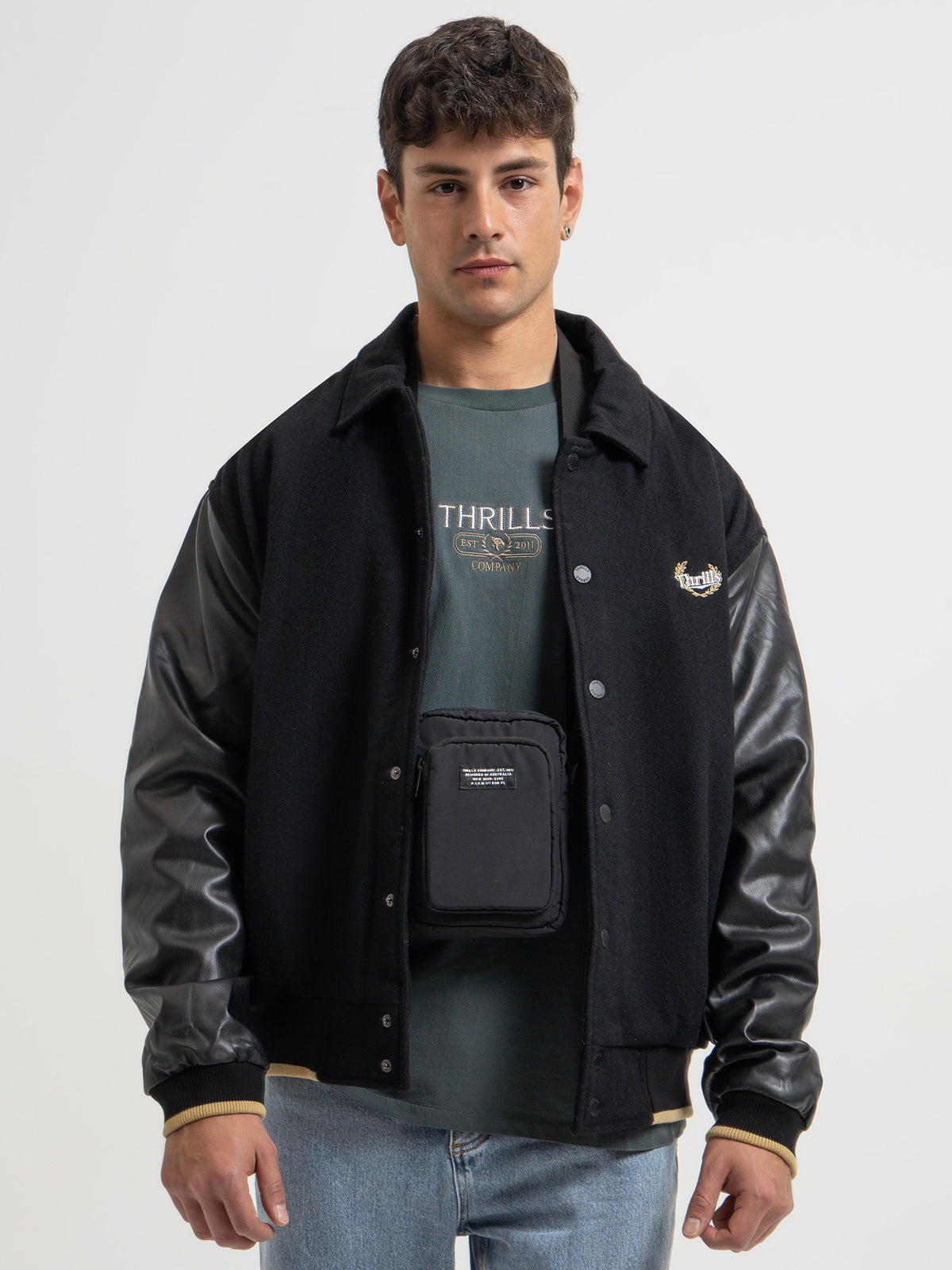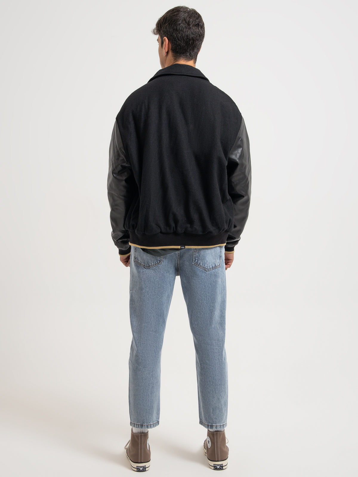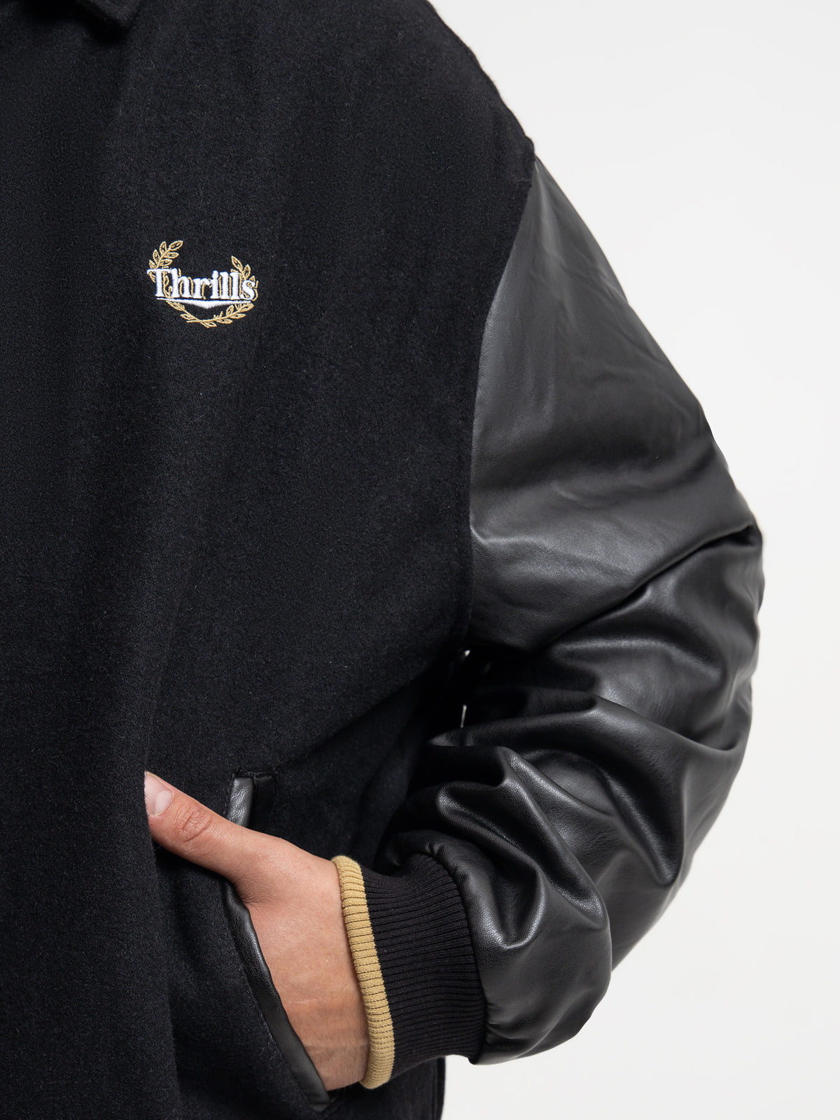 Materials: Shell: (50% Melton Wool, 50% Polyester) / Sleeves: (PU Faux Leather) / Lining: (100% Polyester).