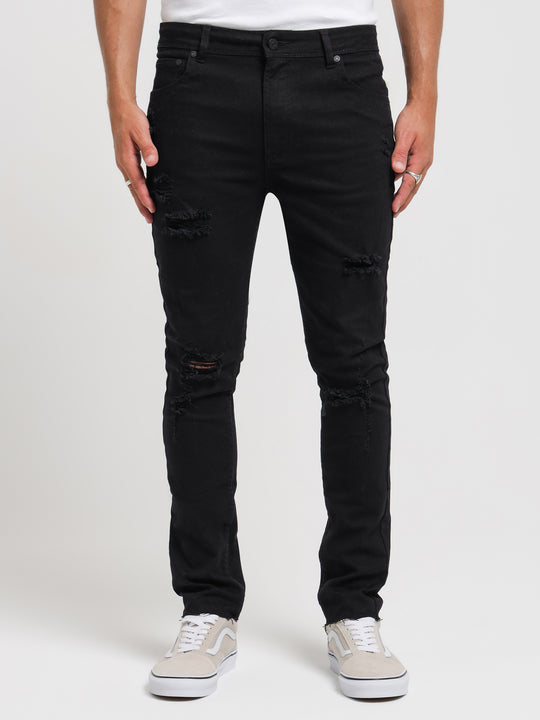 The Arden Rip Skinny Jeans in True Black feature ripped detailing throughout for a distressed, lived-in look. This jean is finished with a classic five-pocket design, belt loops, and a button and zip fly.