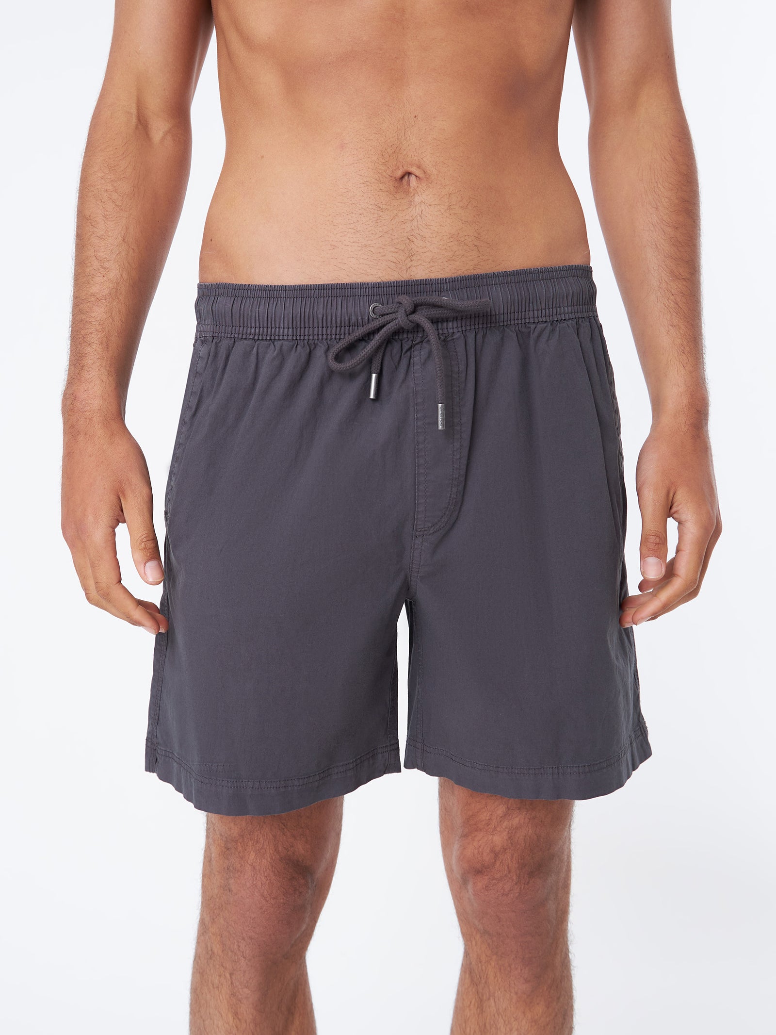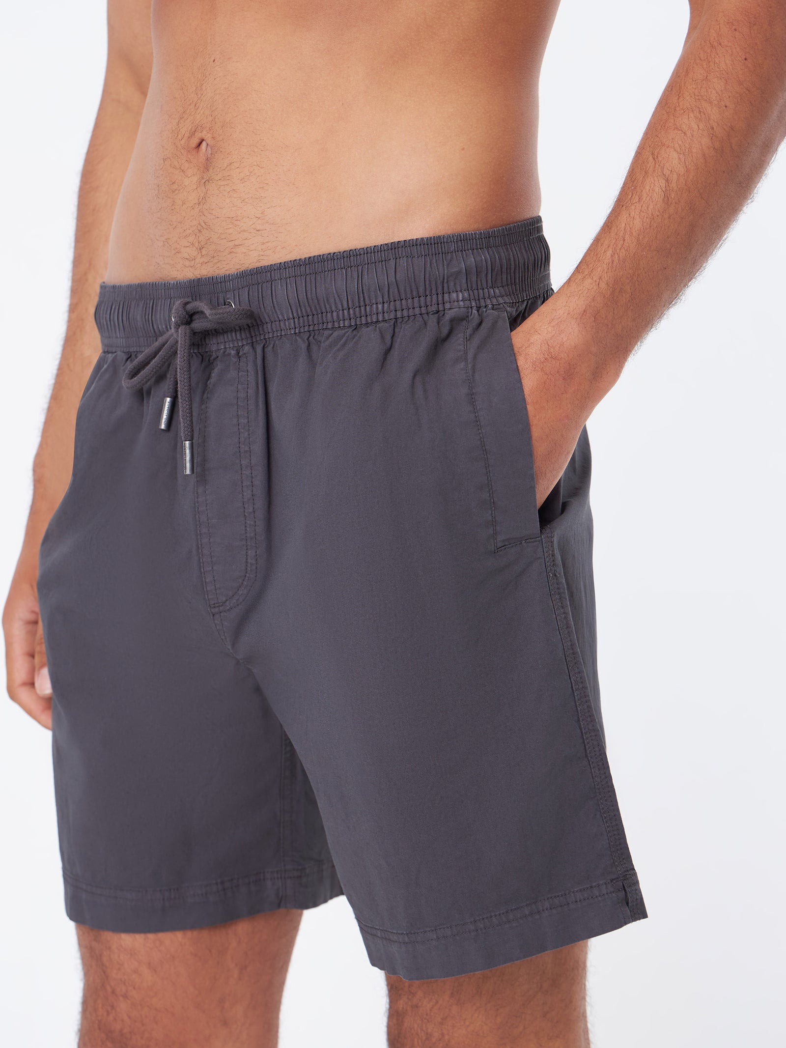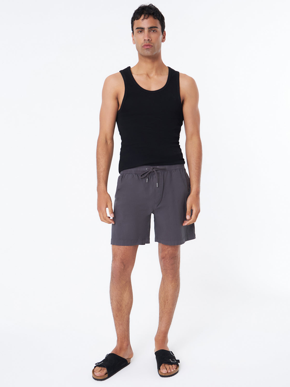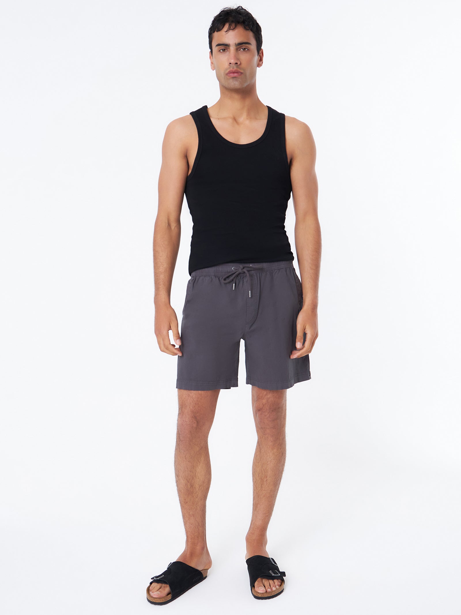 The Bryce Swim Short in Washed Onyx by Article One is designed with a drawstring waistband for a secure and adjustable fit. These swim shorts features a minimalist design and pockets.