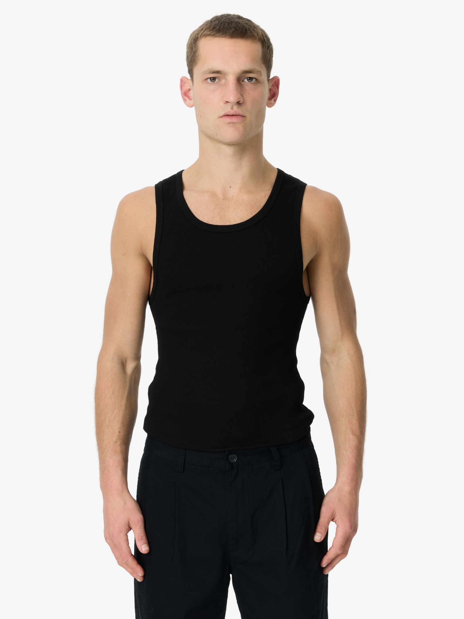 This classic black singlet top features a moderate stretch fabric, ribbed neckline, and a slim fit for a comfortable and stylish fit. Made of 100% cotton, this garment has a straight hemline.