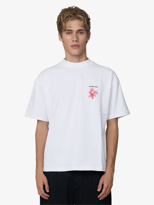The Frangipani Tee by Article One features an oversized, boxy fit. It is constructed with dropped shoulder seams and a thick ribbed crewneck. The design includes a small "article one" logo and frangipani graphic on the left chest, with a large photographic print of three frangipani flowers and branding across the back.