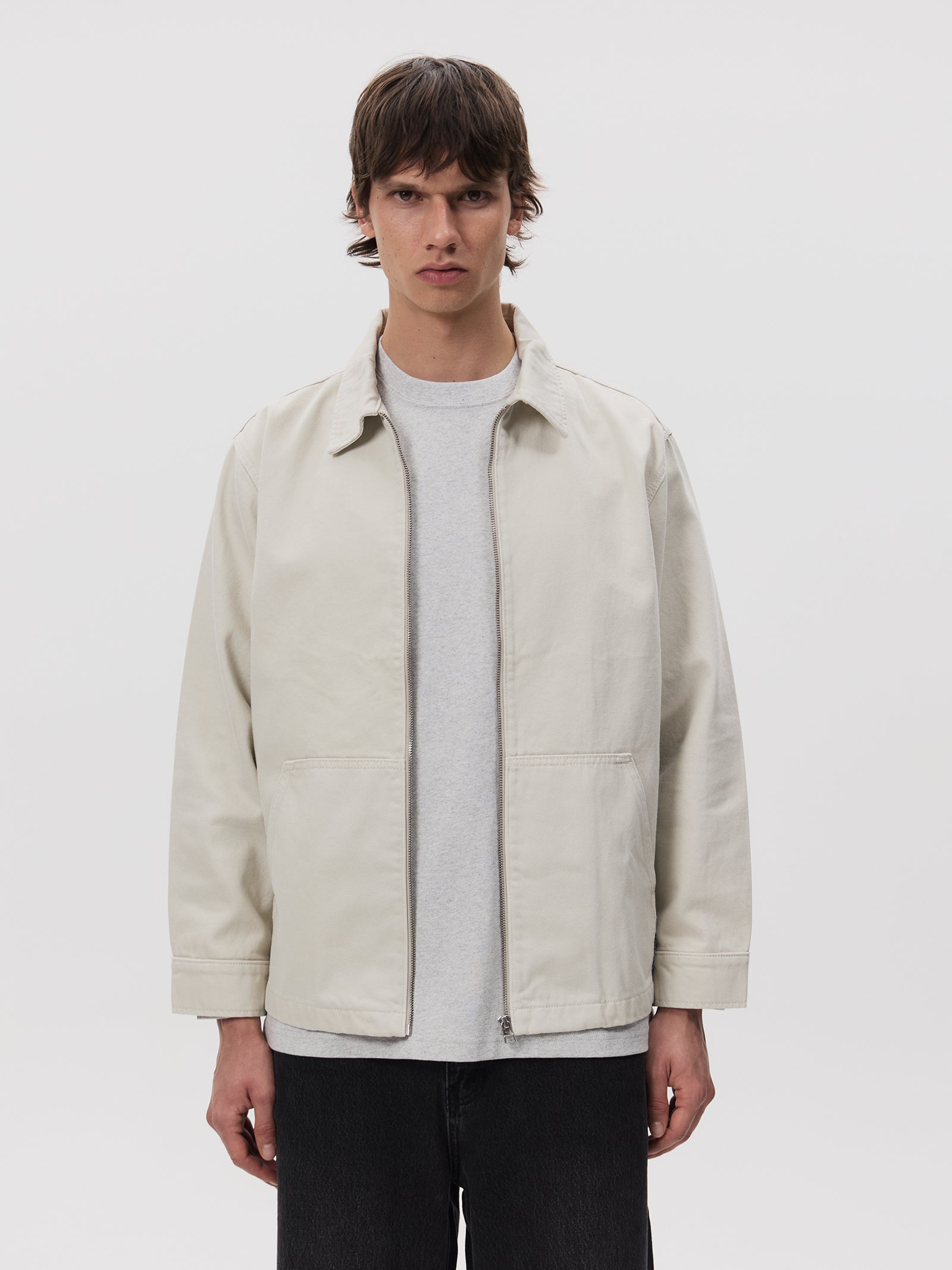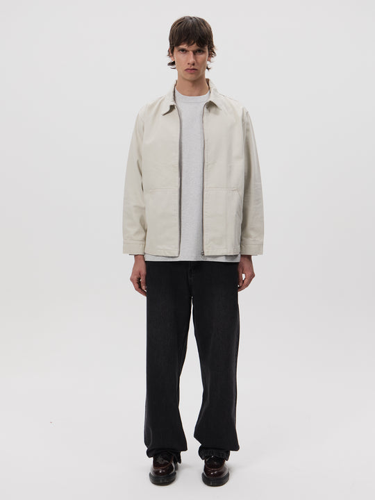 The Gus Jacket in Ecru by Article One features a structured silhouette with a zip-up front, pointed collar, and minimal detailing.