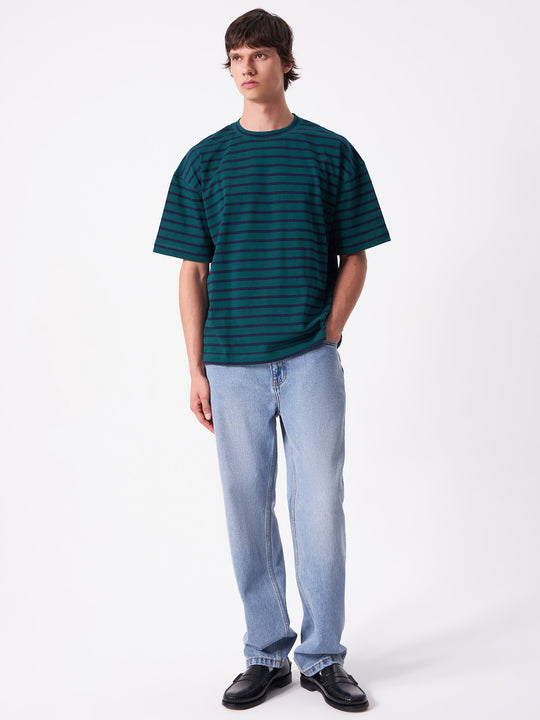 The Stripey Tee by Article One is designed in a relaxed, oversized fit. This striped T-shirt features a classic crew neckline in a rich green hue.