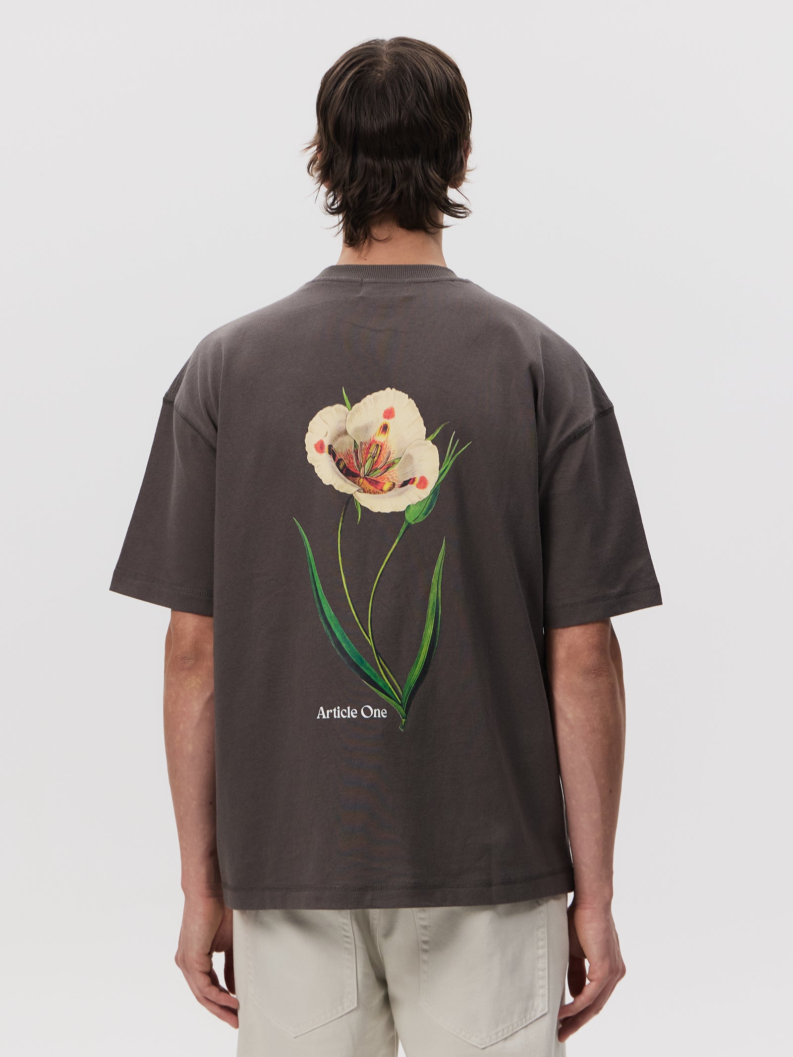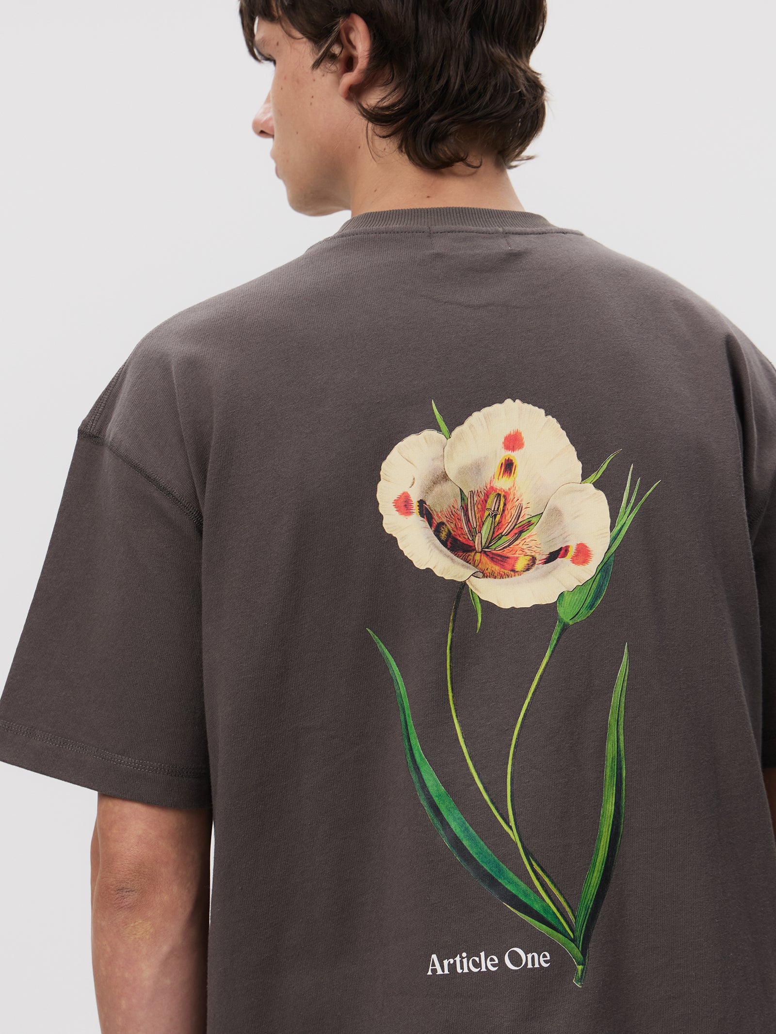 The Mariposa Logo Tee in Obsidian by Article One is designed with an oversized fit. This tee features a bold flower graphic on the back, and centre script logo.