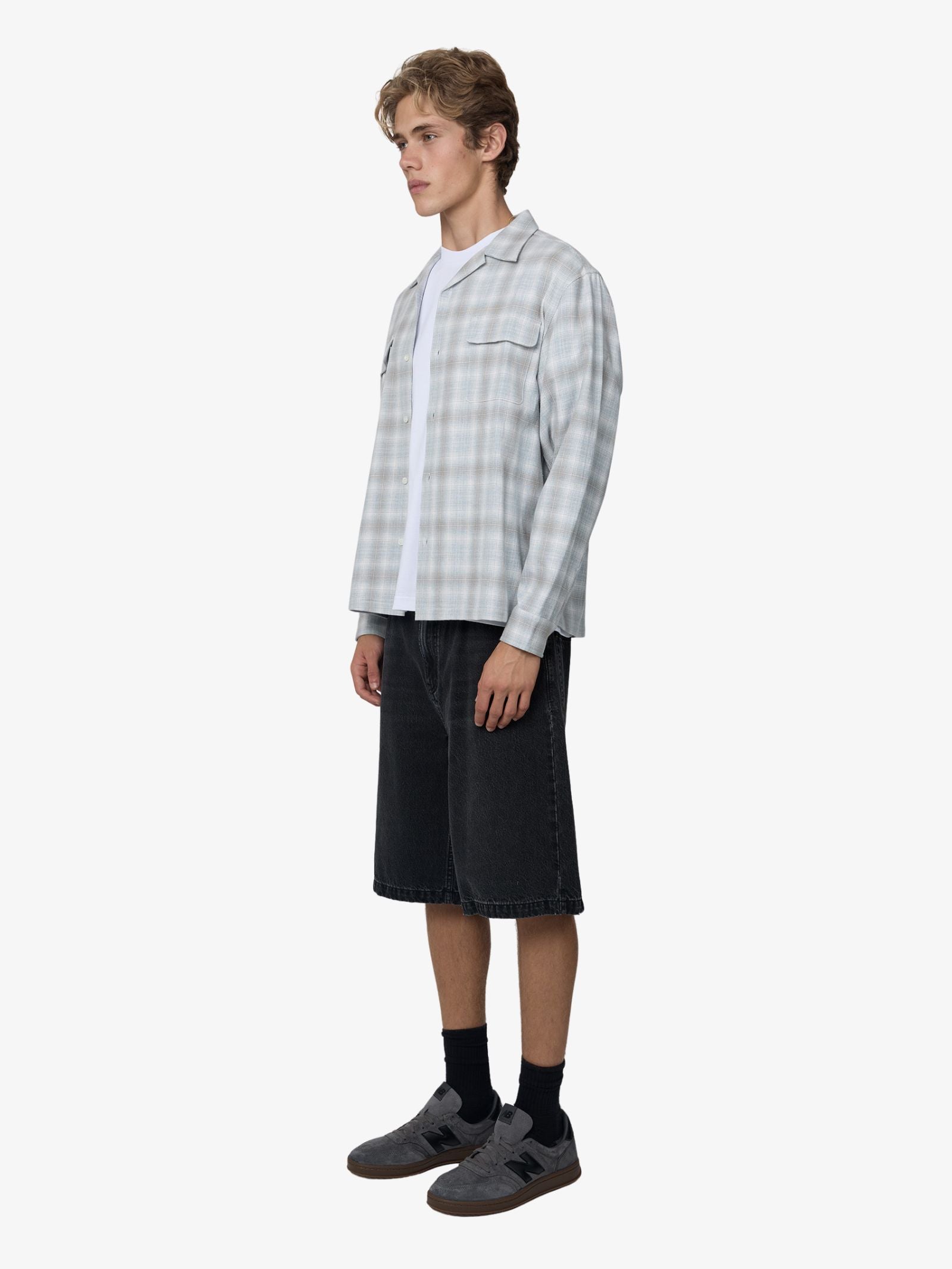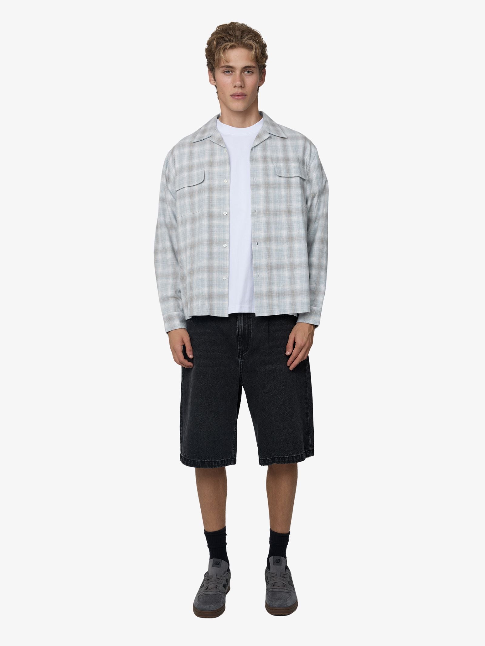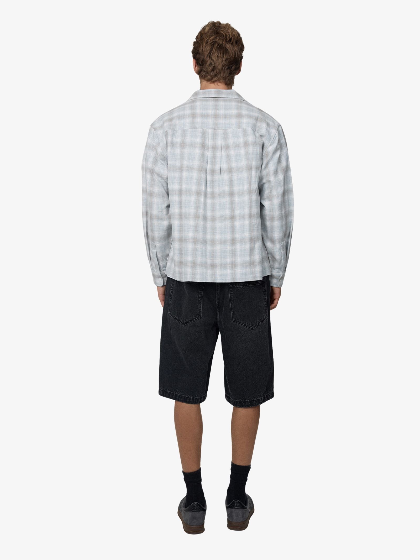 The Mavis Midweight Check Overshirt by Article One features a relaxed, boxy fit. It is constructed from a lightweight, textured fabric with an all-over plaid pattern. The design includes a classic camp collar, a full button-down front, and two flap pockets on the chest.