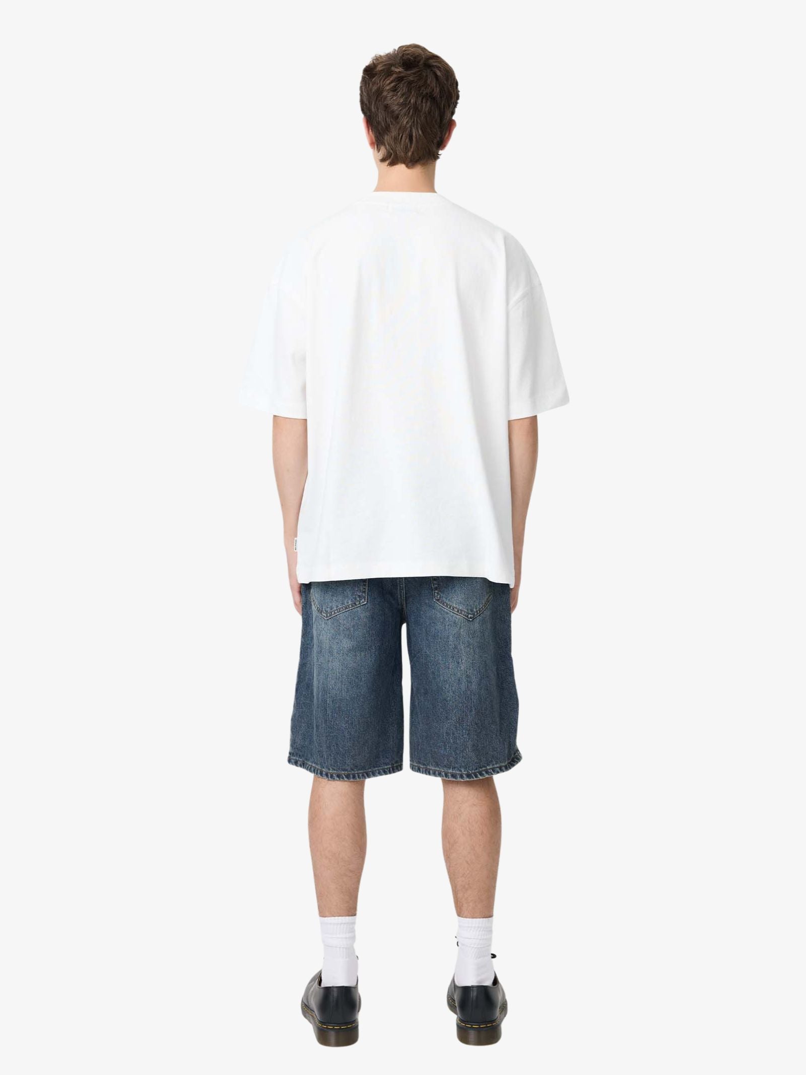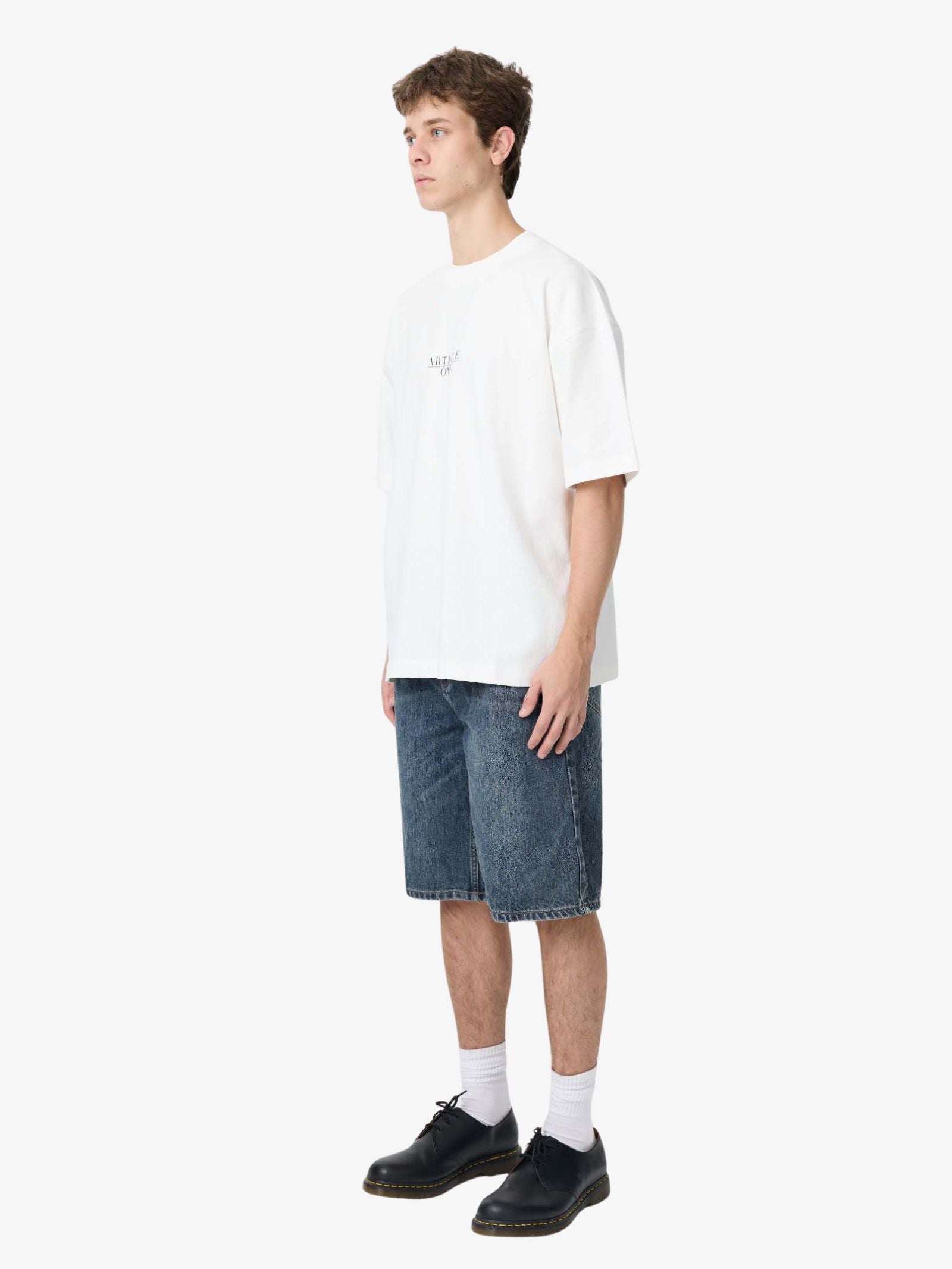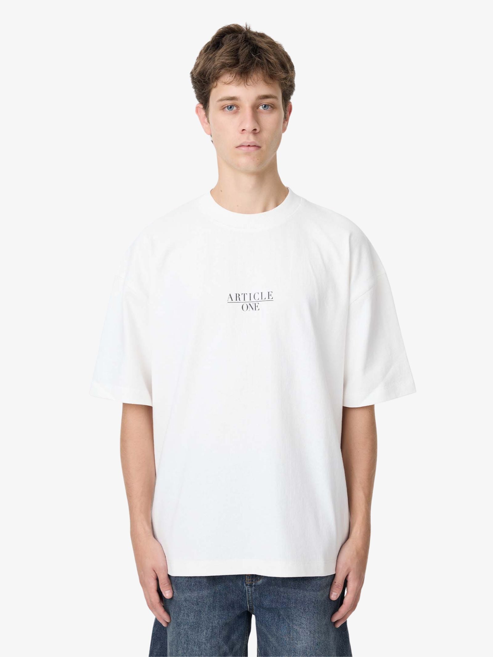 The Nice Serif Tee by Article One is made from soft cotton jersey and designed with a straight, relaxed fit. This clean white short-sleeve shirt features the brand name printed subtly in black, centered just below the crew neckline.