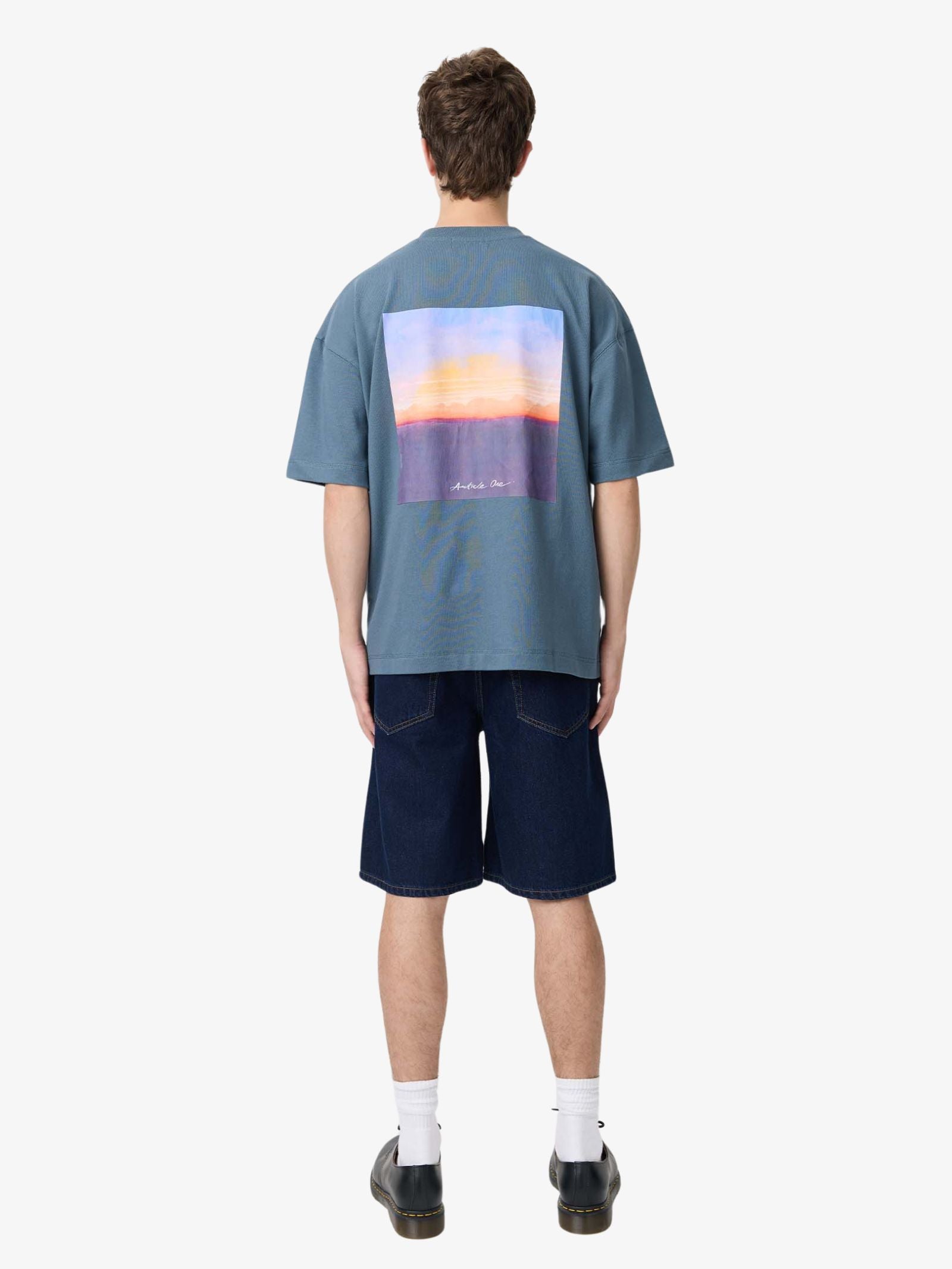 The Peaceful Sky Tee by Article One is made from soft, textured cotton jersey and designed with a straight, relaxed fit. This short-sleeve shirt features a small, colorful horizon graphic on the front chest and a large scenic sunset print covering the back.