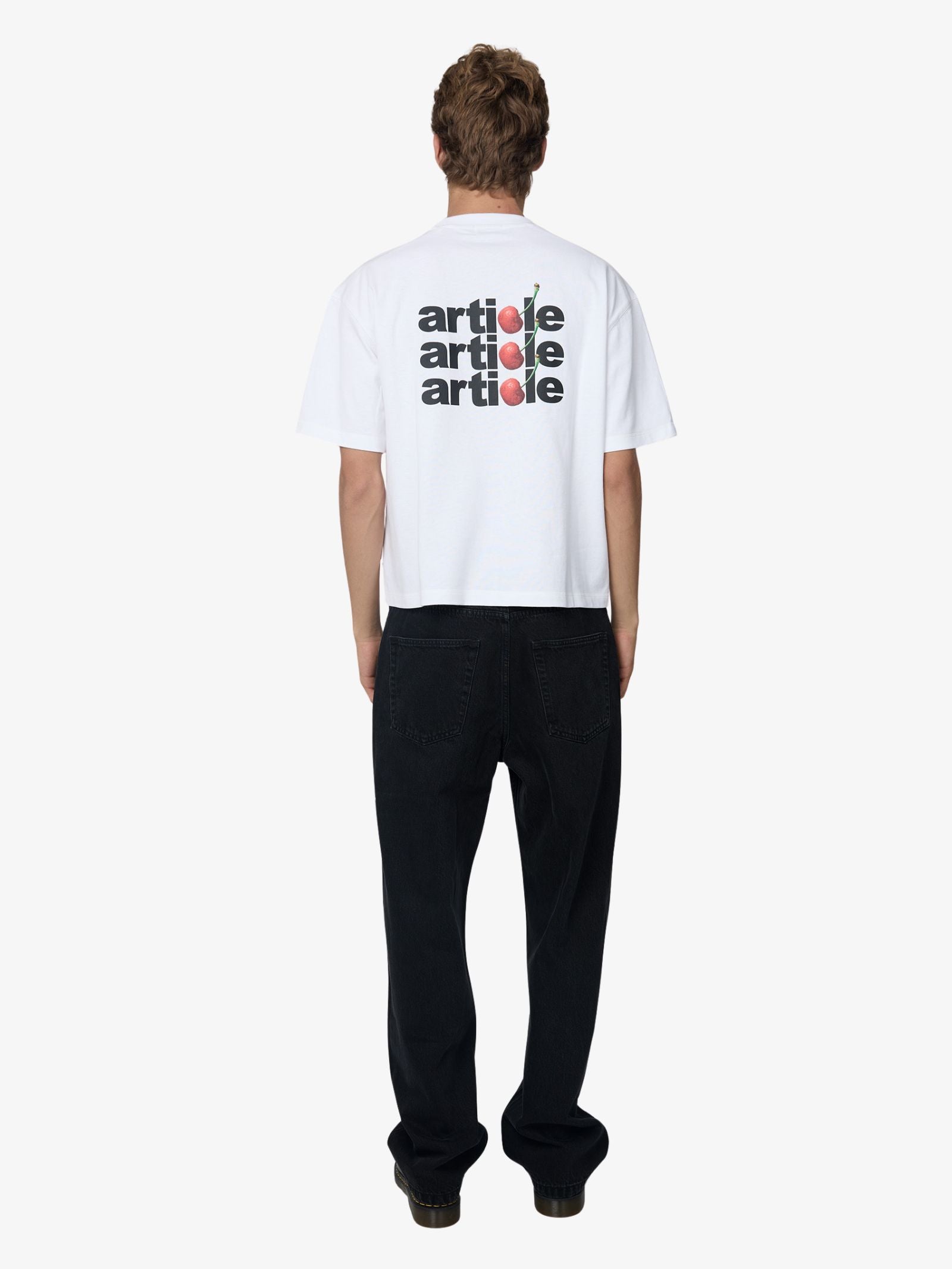 The Pitted Tee by Article One features an oversized, boxy fit. It is constructed with dropped shoulder seams and a high-ribbed crewneck. The design includes a small photographic cherry print on the left chest and a large back graphic featuring three vertical "article" logos overlaid with three red cherries.