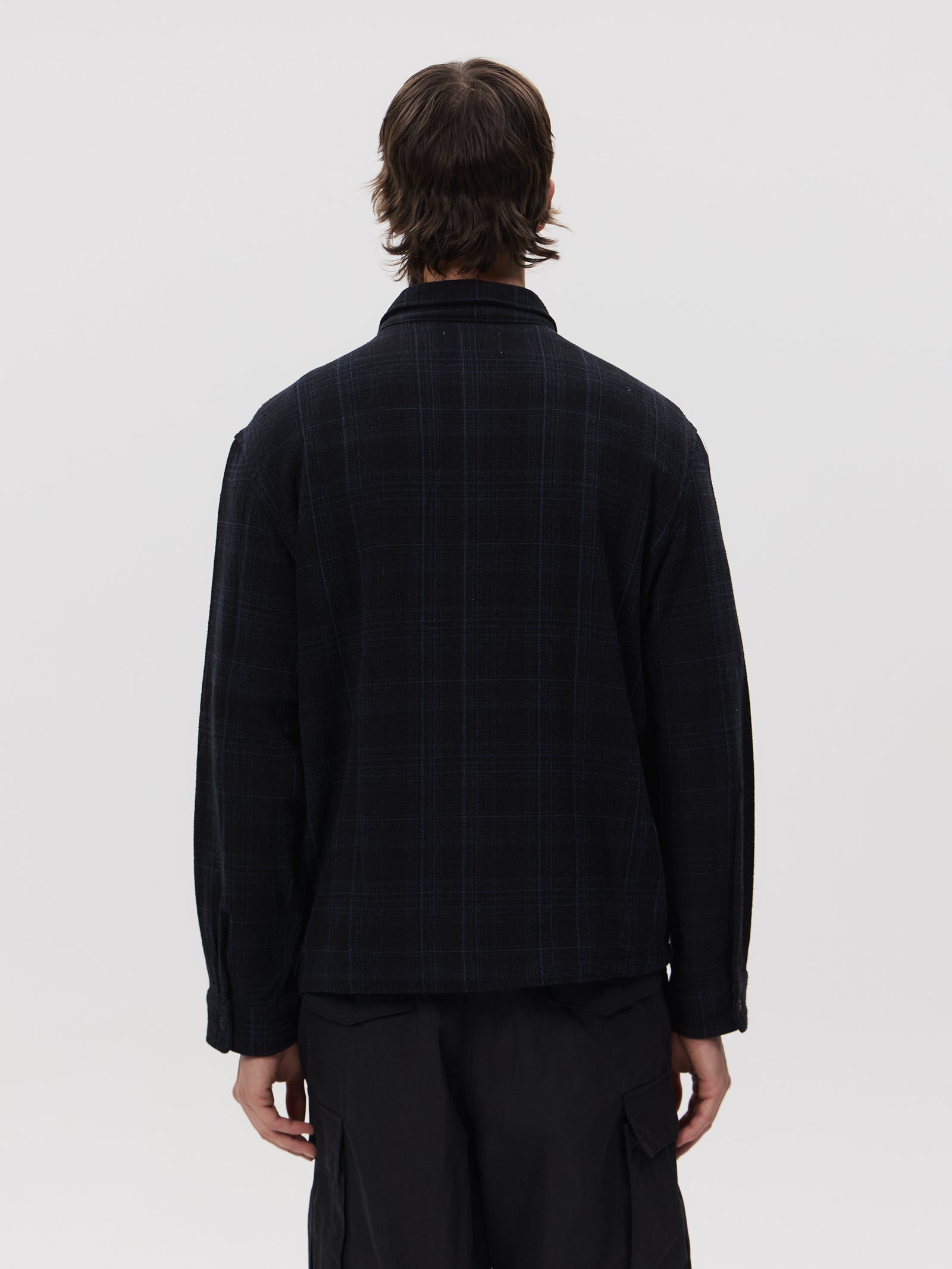 The Porter Zip Shirt in Black and Blue by Article One features a sleek zip-up front, structured collar, and clean lines. This shirt offers a deep black tone and a relaxed fit that ensures all-day comfort.