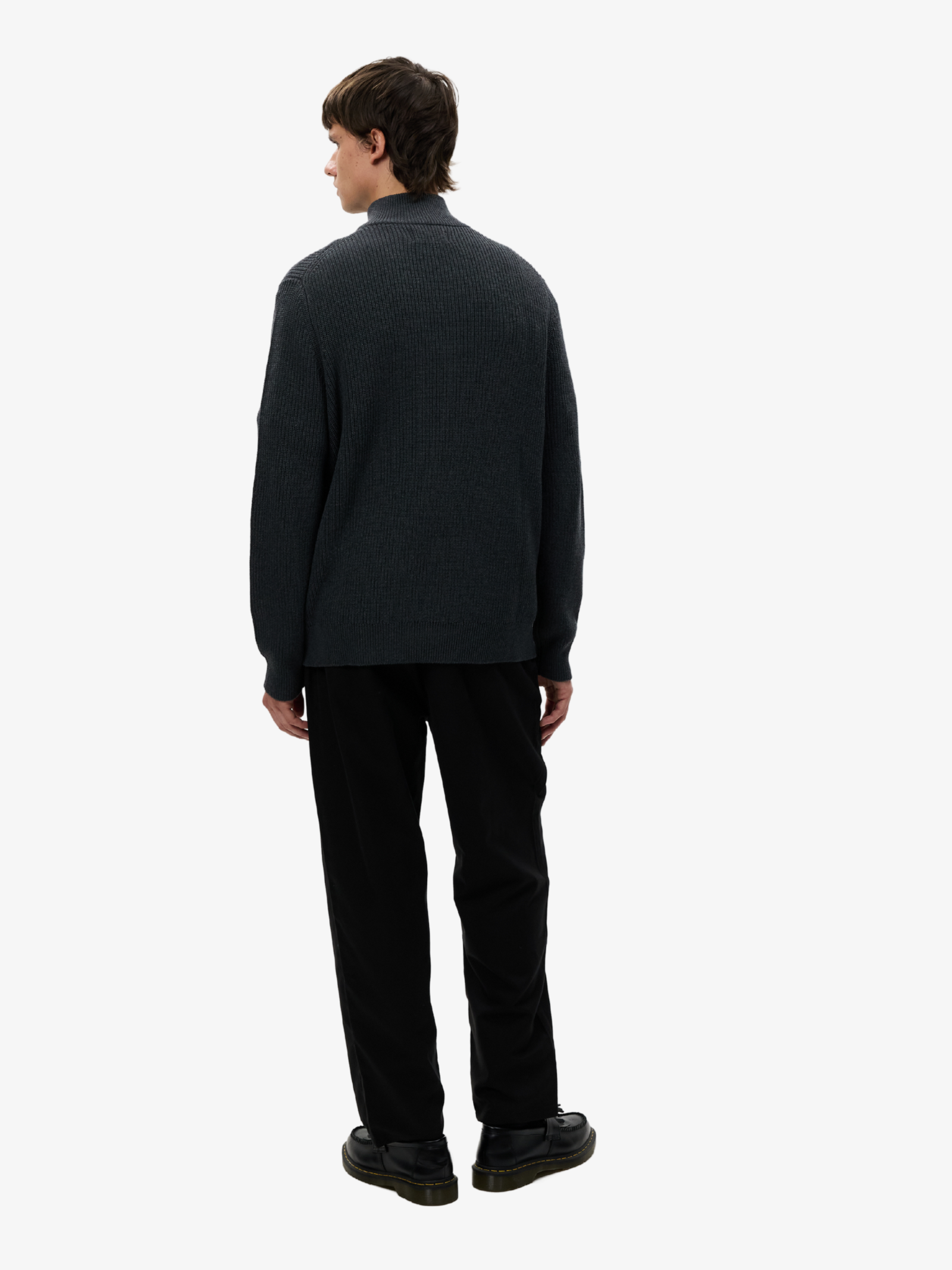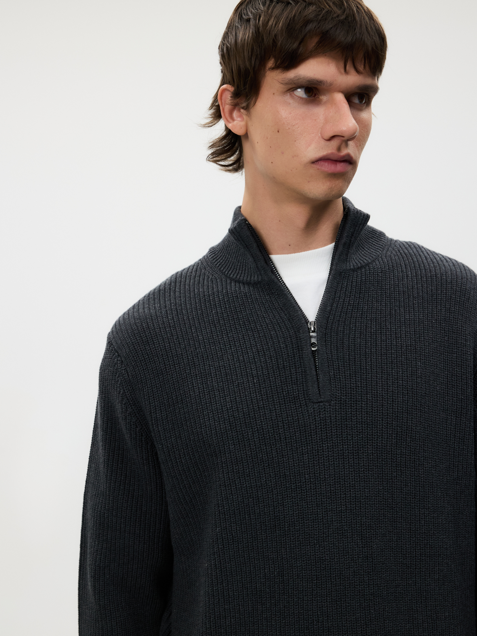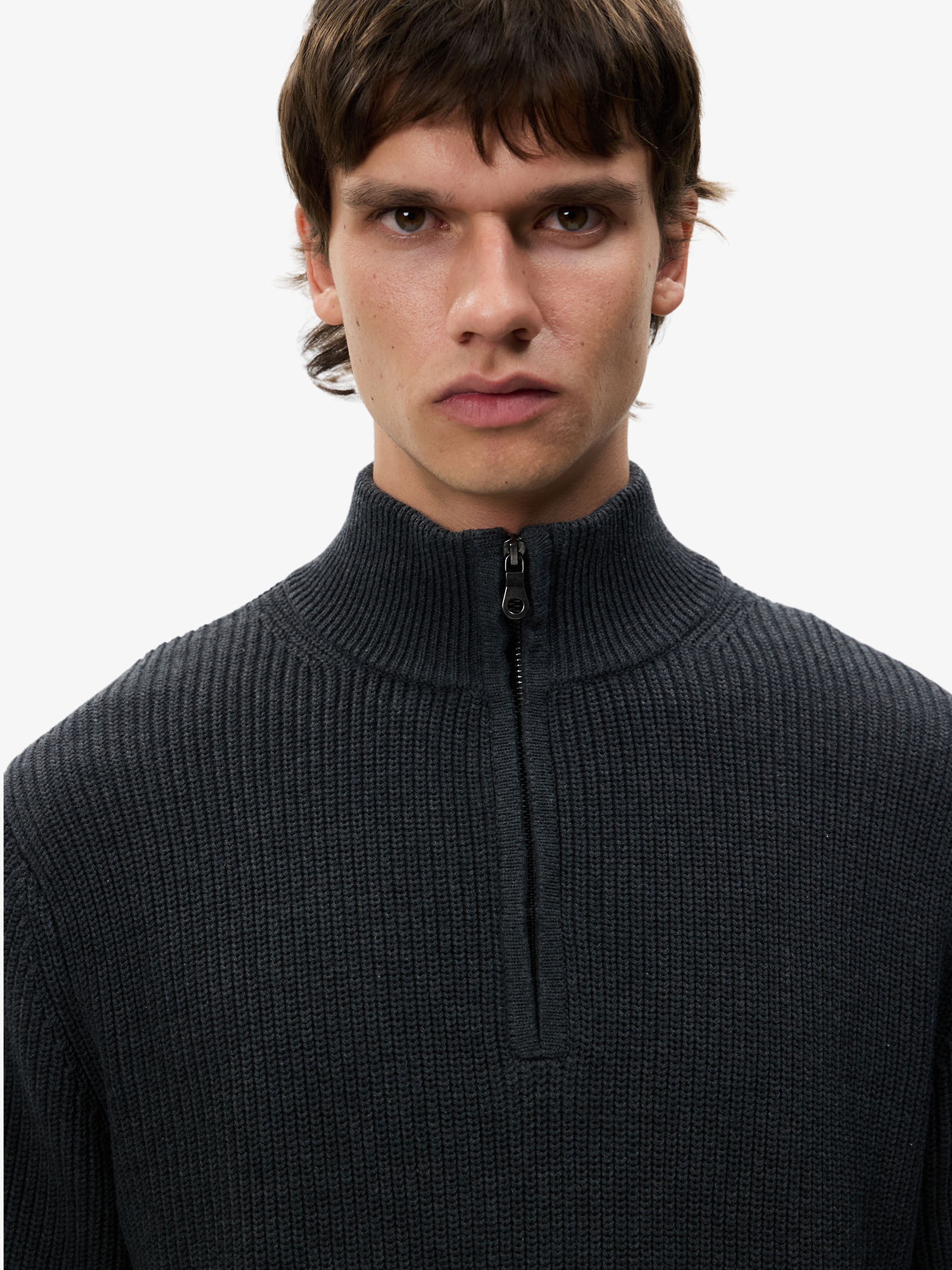 The Rib Quarter Zip Sweater by Article One is in a deep charcoal shade with a soft ribbed texture.