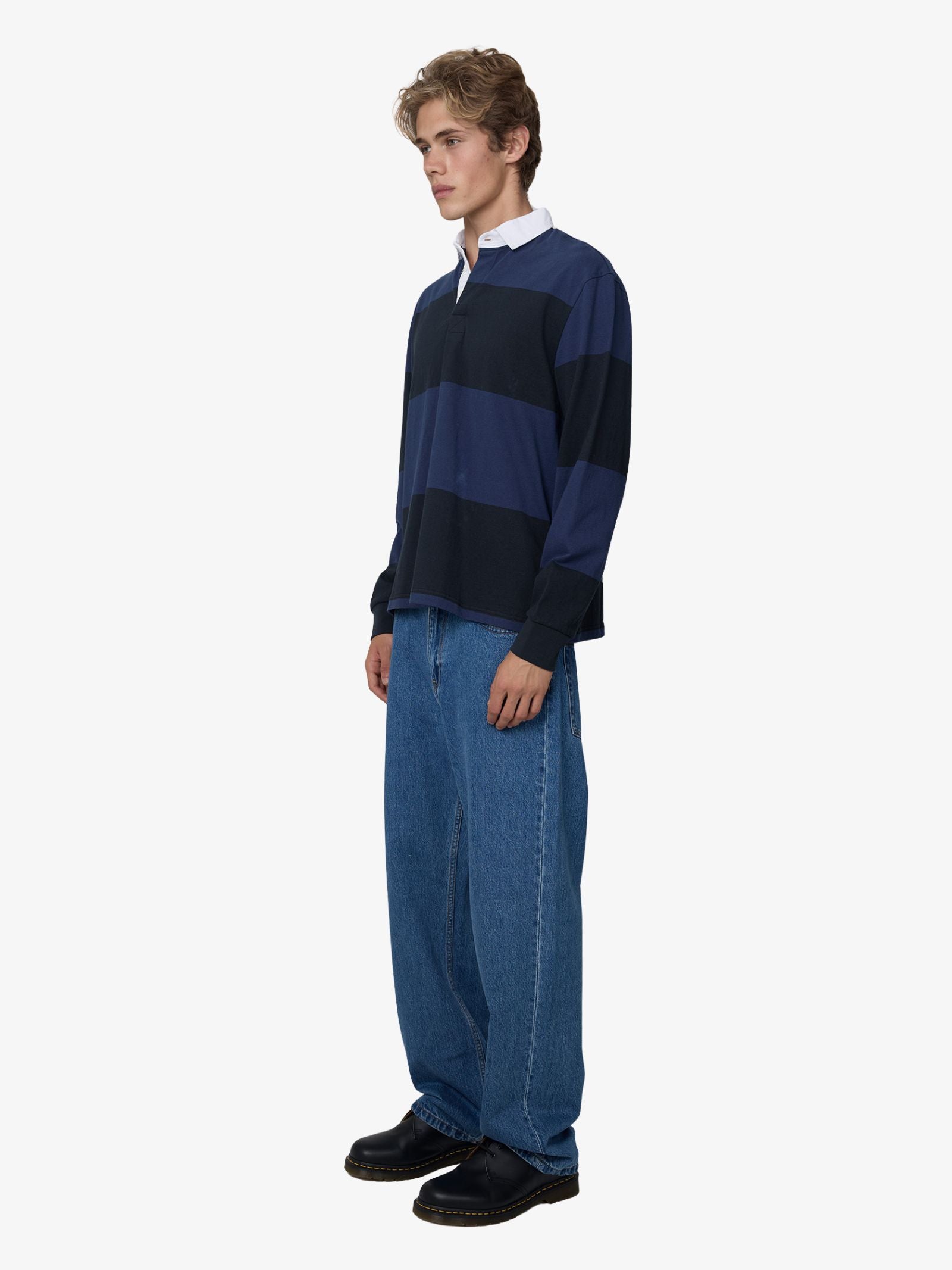 The Tate Rugby by Article One features a relaxed, boxy fit. It is constructed from a heavy-weight cotton jersey with a bold, horizontal striped pattern in navy and black. The design includes a contrasting white twill collar, a hidden button placket, and ribbed cuffs at the sleeves.