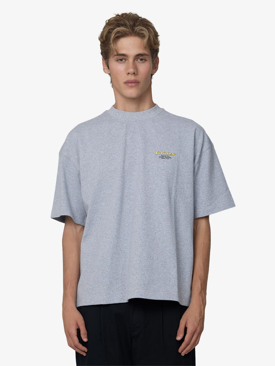 The Vacanza Tee by Article One features an oversized, boxy fit. It is constructed with dropped shoulder seams and a high-ribbed crewneck. The design includes a small yellow "La Vacanza" script logo on the left chest and a large vintage-style photographic print on the back depicting a coastal town with the brand's vacation-themed branding.