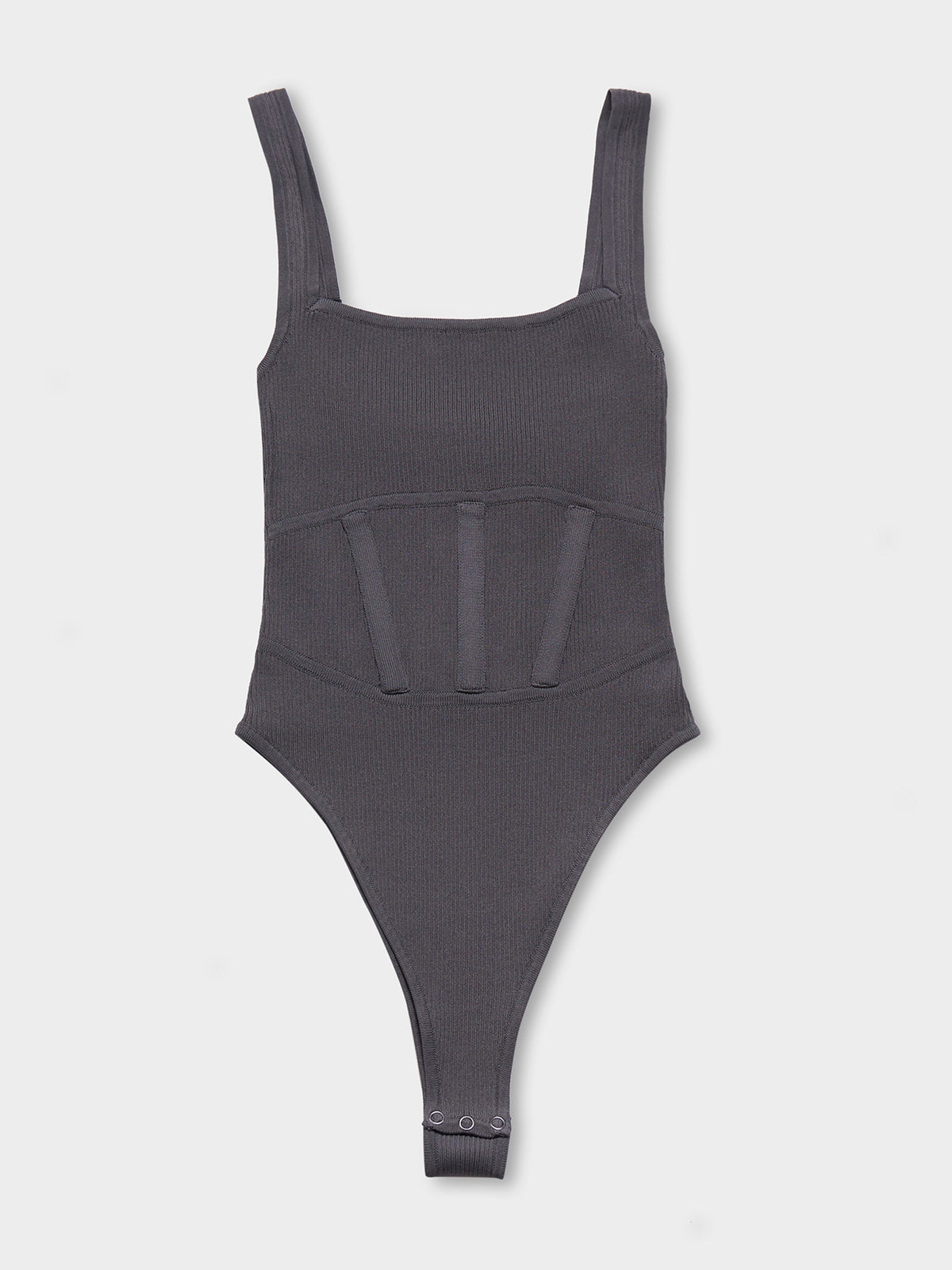 Sculpted sophistication meets everyday ease with the Aurelia Knit Bodysuit from MSE. Crafted in a striking gunmetal hue, this corset-inspired design features flexible plastic paneling and a curved hemline for a structured yet flattering fit. Ribbed throughout for moderate stretch, it offers both comfort and contour. Adjustable medium straps and a center-back zip closure ensure a secure fit, while the high-cut bottom enhances sleek styling. Perfect for elevated layering or statement solo wear.