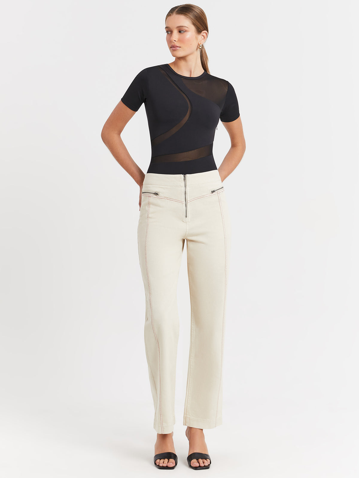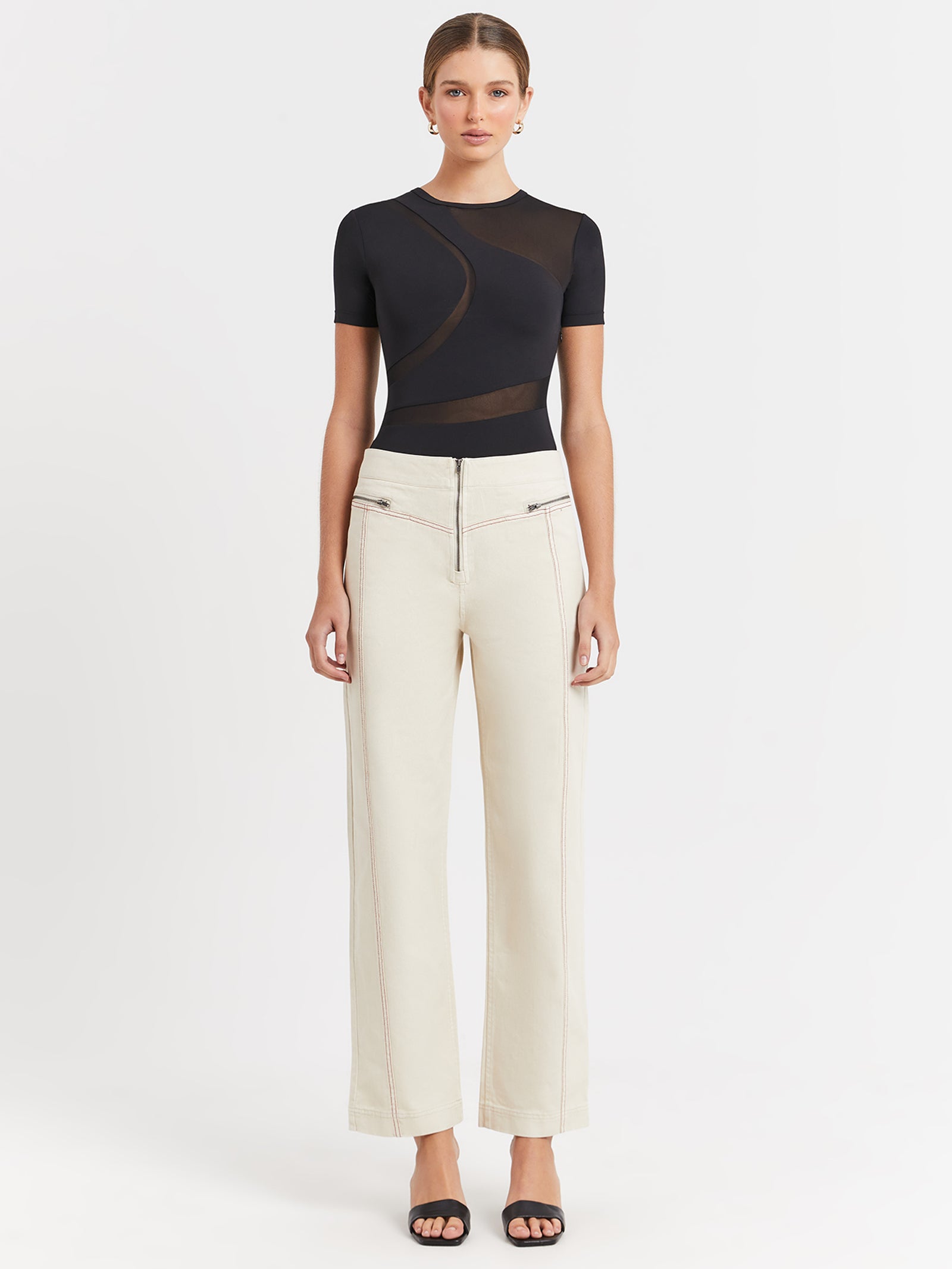 The Avalon Bodysuit offers a sleek and flattering silhouette with its fitted design and crew neckline. The short cap sleeve adds a touch of coverage, while the nylon and mesh panelling provide breathability and comfort. The invisible side zipper allows for easy wear and removal.