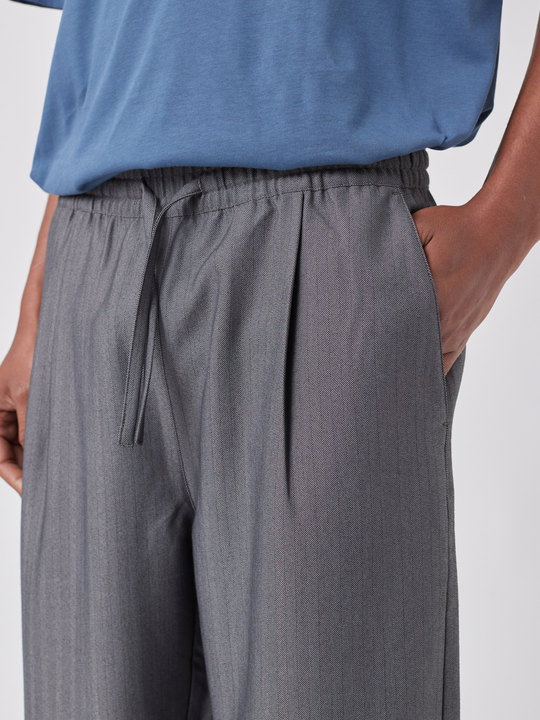 The Boxy Suit Pant in Grey Herrin by Barnet Cools is constructed from premium suiting fabric. This pant is designed with an elastic waistband, fabric drawcord, front pleats, and a regular rise.