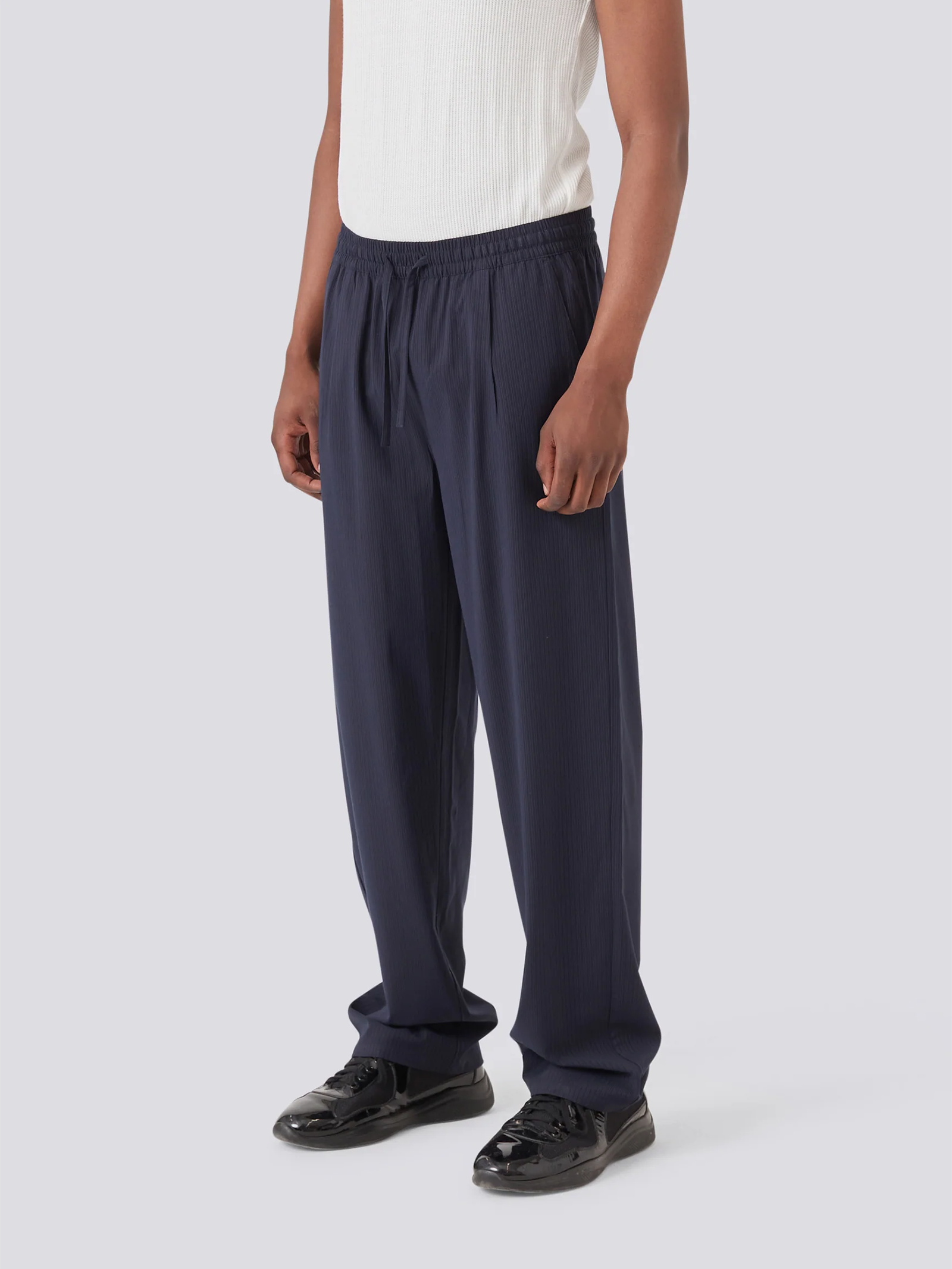 The Boxy Suit Pant in Slate Stripe by Barney Cools is crafted from premium suiting fabric. This pant features a relaxed fit and an adjustable waistband.