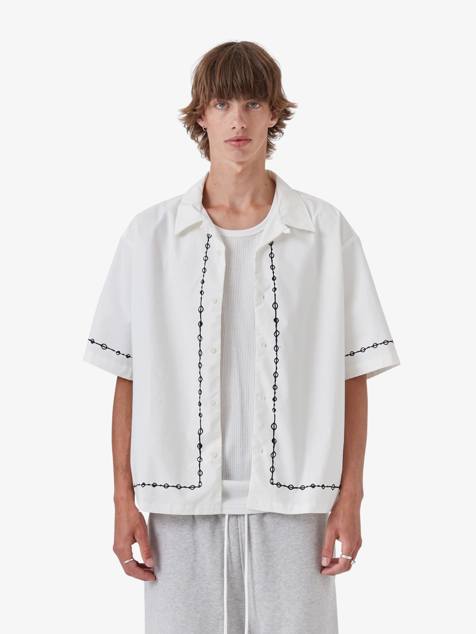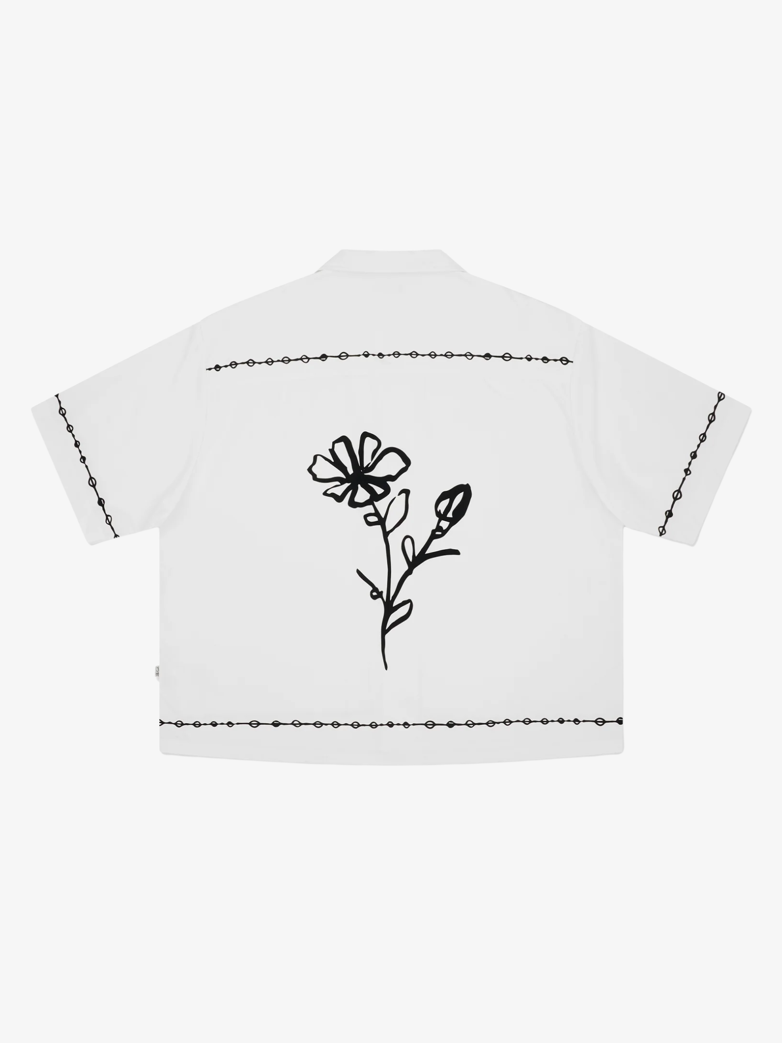 The NS Shirt in White by Barney Cools is cut in a boxy, slightly cropped fit. This shirt features custom printed borders frame, and a striking floral graphic.