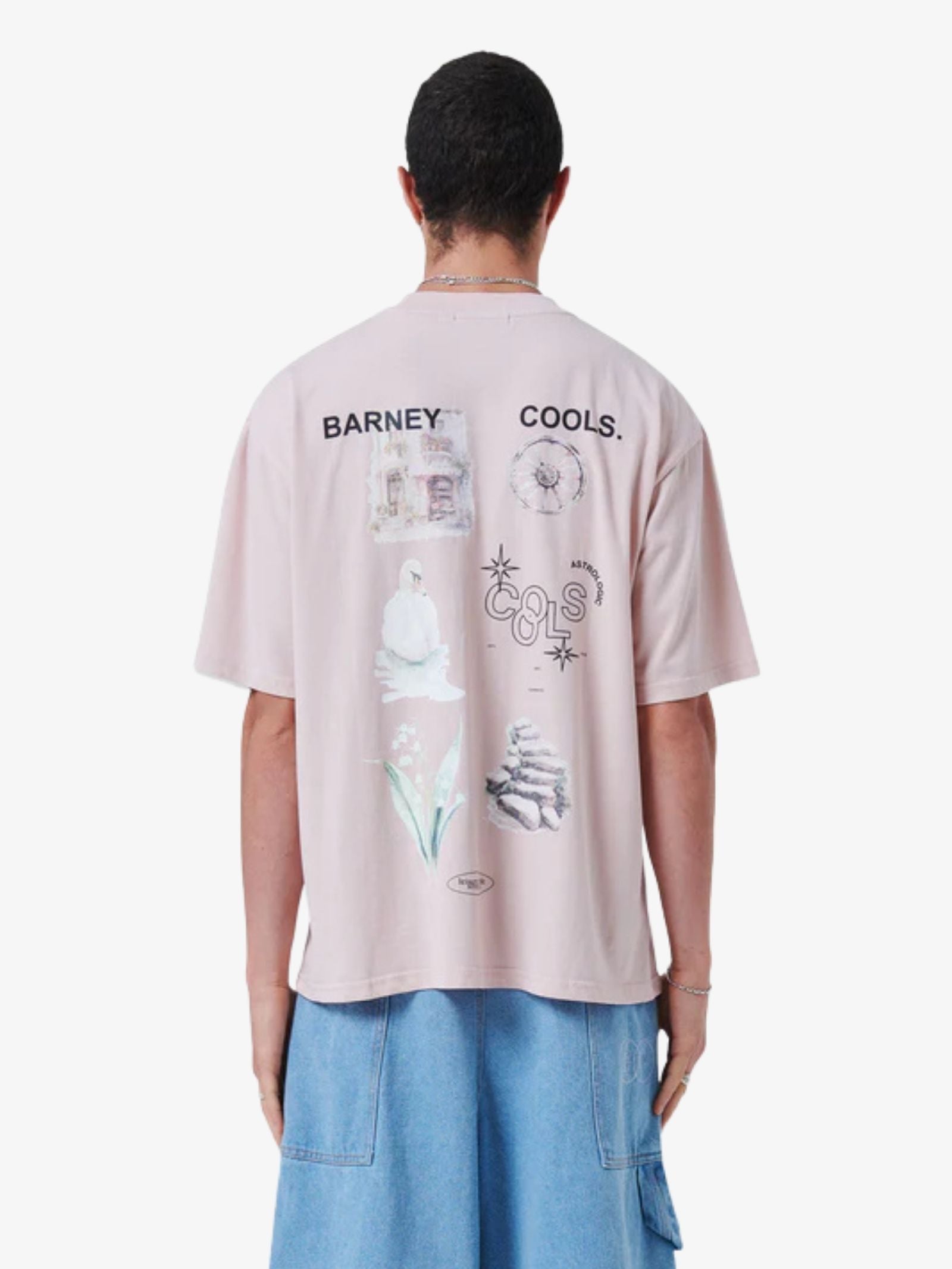 The Terrace T-Shirt by Barney Cools features a softener and enzyme wash that delivers a smooth hand feel and a faded pink finish. Designed with a boxy fit and standard length, the silhouette is finished with a thicker neckline for added structure. Graphic artwork is applied through a mix of screen print and digital print on the front and back.