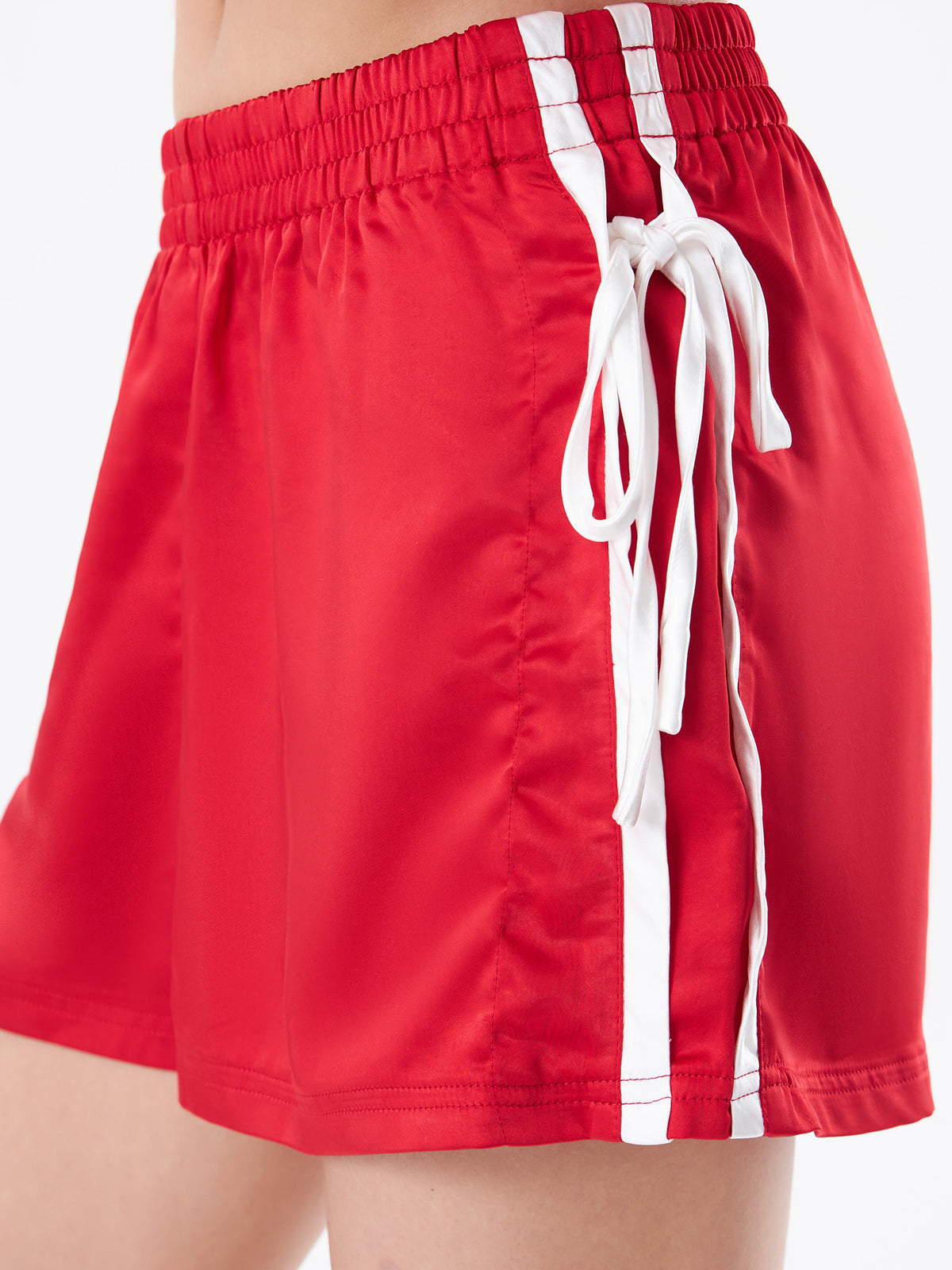 Add a pop of colour to your casual wardrobe with the Nori Mini Short by Beyond Her. These cherry red mini shorts feature bold white side stripes and a comfortable, garterized waistband for a flexible fit. Perfect for sporty and laid-back looks alike, they pair effortlessly with crop tops or oversized tees for an eye-catching, easygoing style.