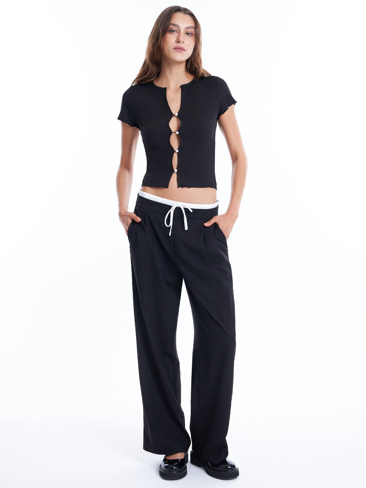 This stylish Polly Top top features a sharp V-neck and an open front with beaded closure, adding a unique touch of edge and allure. The cropped finish perfectly complements high-waisted bottoms, creating a striking silhouette that's hugs the torso comfortably.