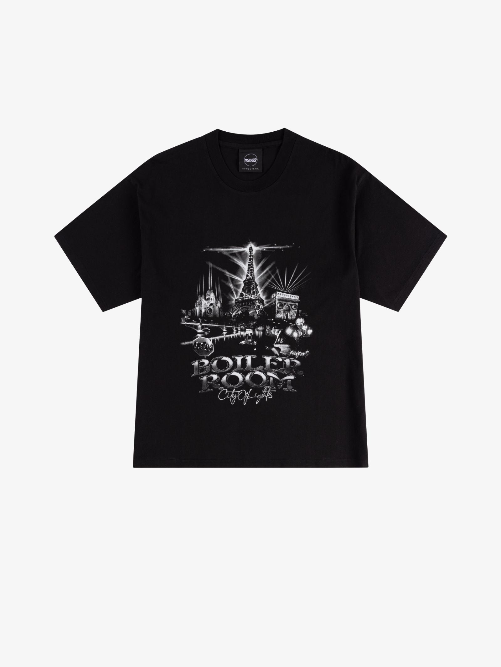 The Paris City T-Shirt by Boiler Room is made from soft cotton jersey and designed with a straight, relaxed fit. This black short-sleeve shirt features a dramatic Paris cityscape graphic on the front and a separate graphic on the back with music-themed text and cartoon elephants.