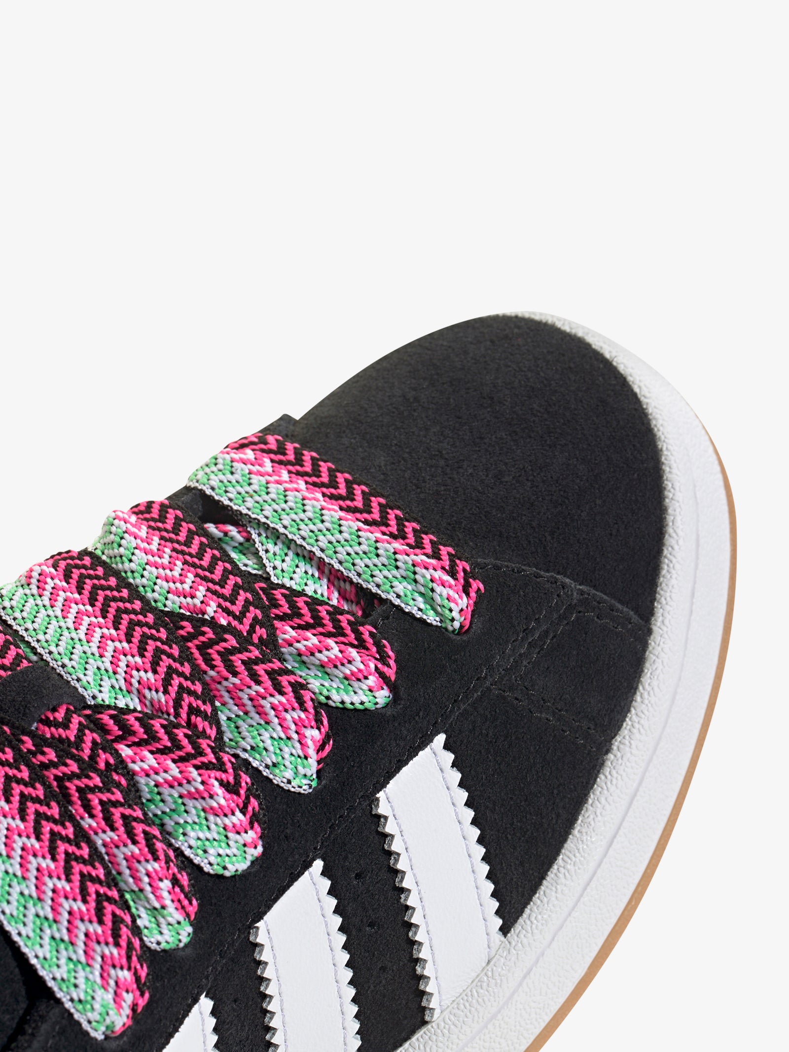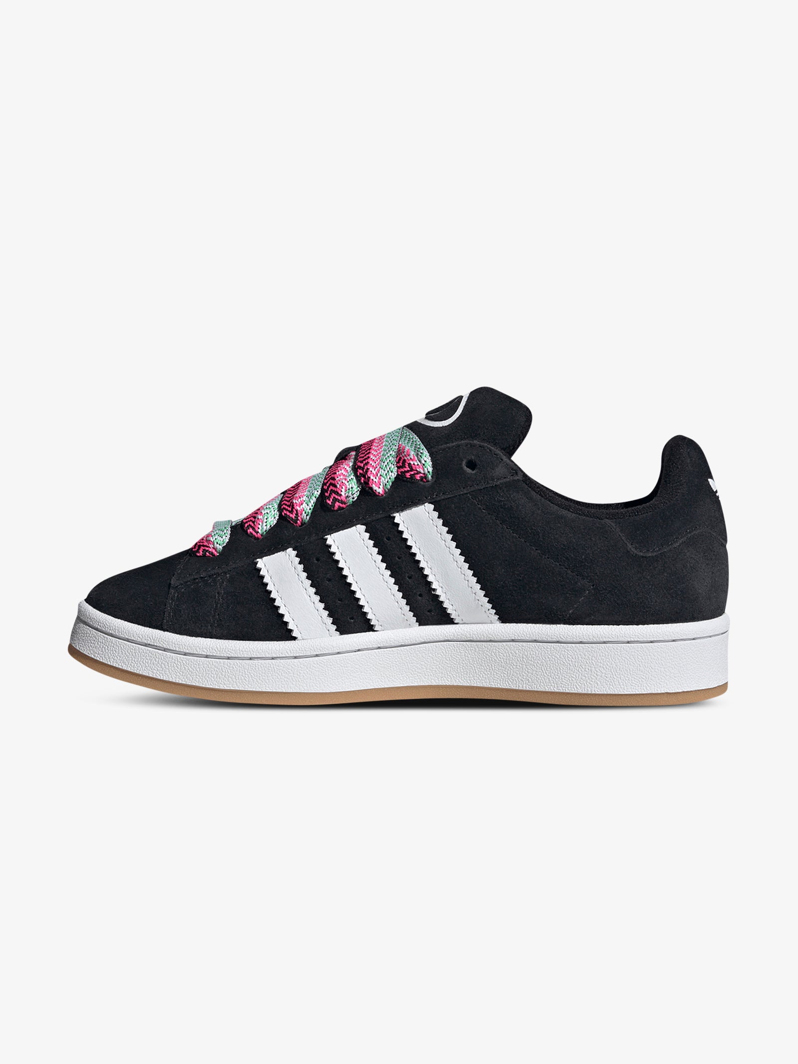 The Campus 00S in CoreBlack/LucidPink/CloudWhite by Adidas is crafted with a premium suede upper. This sneaker features a regular fit, lace-up closure and gum rubber outsole.