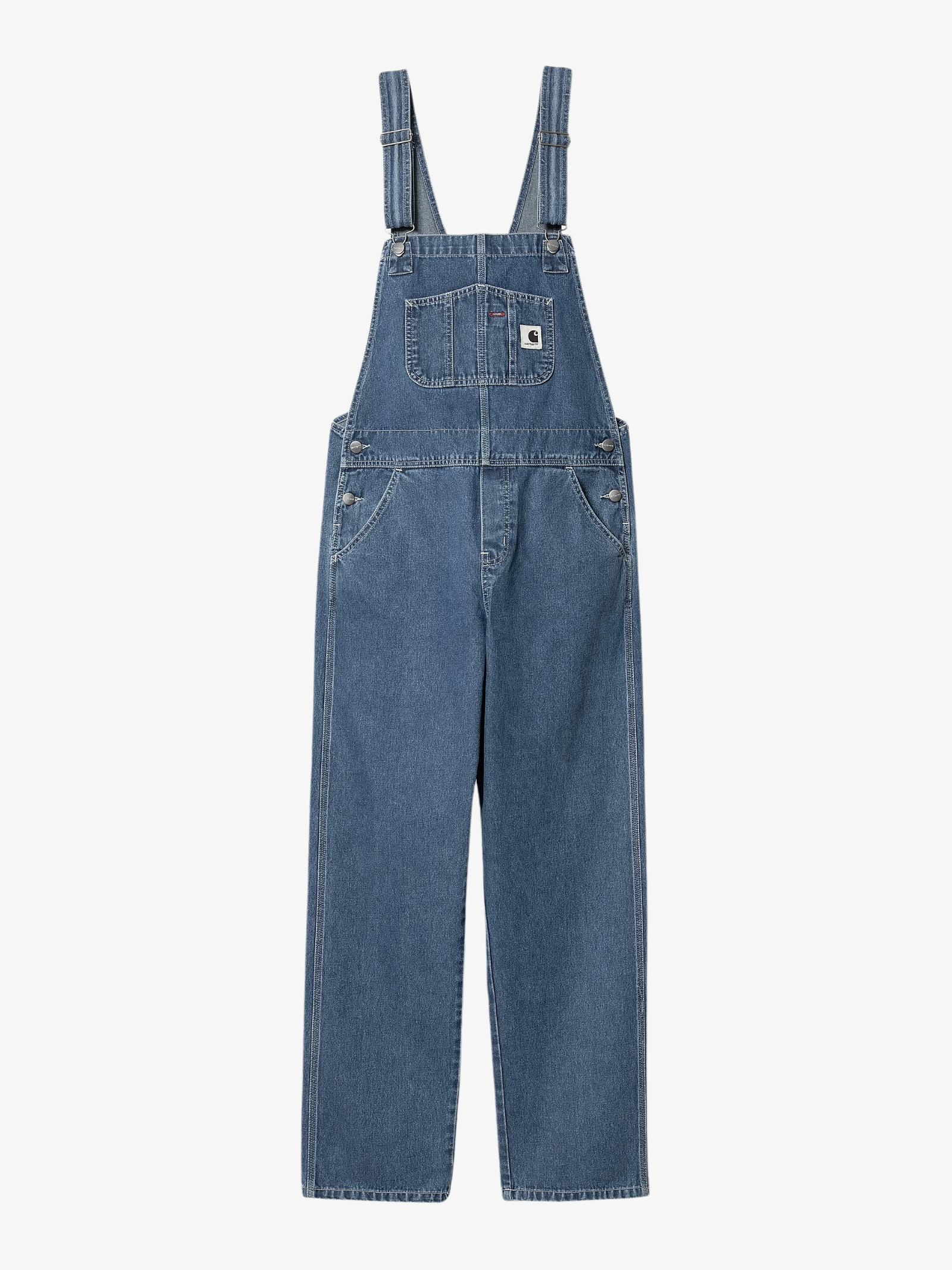 The Women's Bib Overall Straight in Blue Stone Washed by Carhartt WIP is crafted from durable 100% cotton 'Maverick' denim. These overalls has a stone-washed finish.