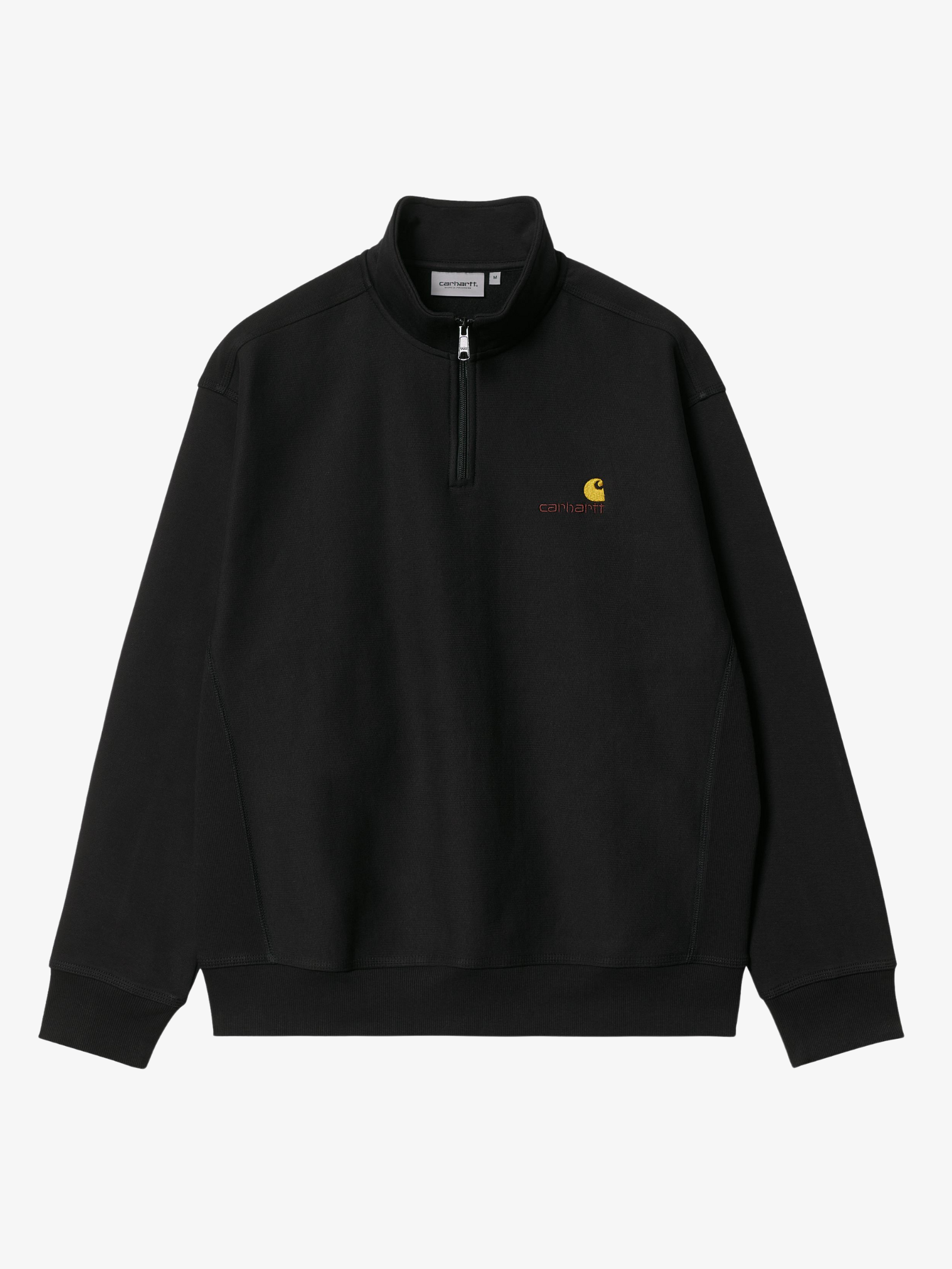 The Half Zip American Script Sweat in Black by Carhartt WIP is made from a heavyweight brushed cotton blend. This sweatshirt features a loose, boxy silhouette, a high zip neck and subtle embroidered branding at the chest.