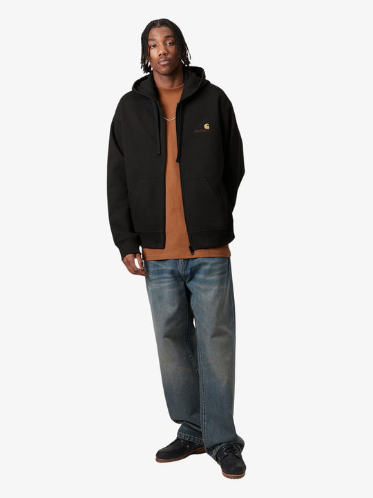 The Hooded American Script Jacket by Carhartt WIP is crafted from heavyweight brushed polycotton jersey. This hooded jacket features a soft fleece-like backing for warmth without bulk and has a loose fit.